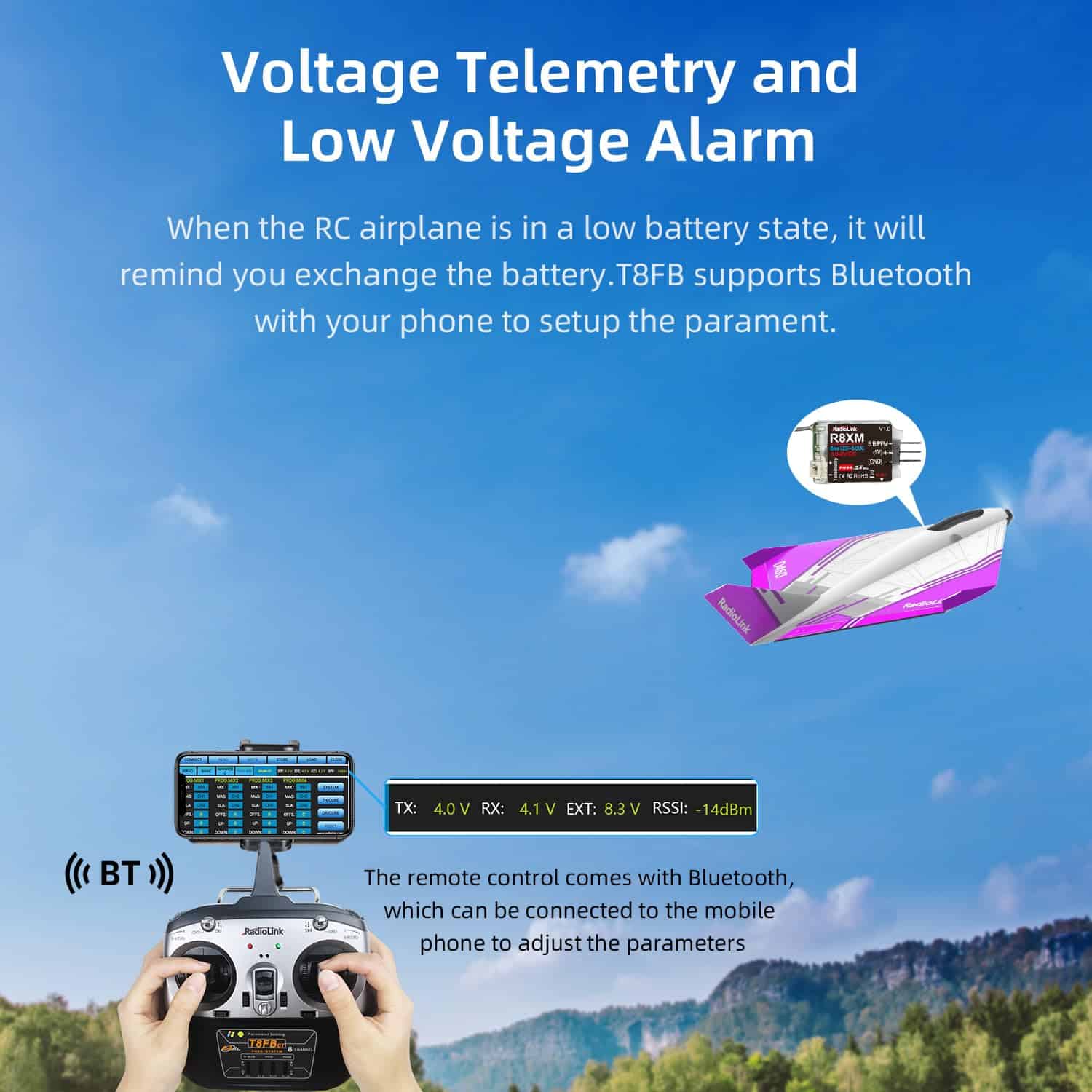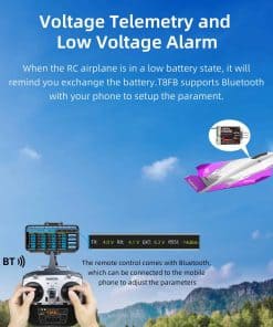 3. Control de Largo Alcance de 2.4 Millas a través del Control Remoto T8FB – con un control remoto inalámbrico de 8CH que soporta control de largo alcance de 2.4 millas, te ofrece una experiencia de vuelo estable. Cuando las baterías estén en estado de baja potencia, el control remoto te recordará que regreses a tiempo. El transmisor T8FB via Bluetooth conecta tu teléfono para ajustar parámetros.
