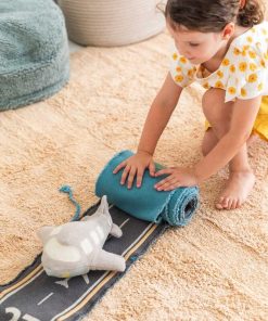 El Avión Ride & Roll consiste en un avión de peluche hecho de lienzo de algodón gris, con ventanas como parches. El avión viene enrollado en una carretera de lienzo de 4 metros de largo en color azul claro, con nubes blancas impresas y parches grises simulando la pista de aeropuerto para despegue y aterrizaje. Con cuerdas trenzadas en los bordes, se puede enrollar y atar fácilmente junto con el cojín del avión, convirtiéndose en un práctico maletín.