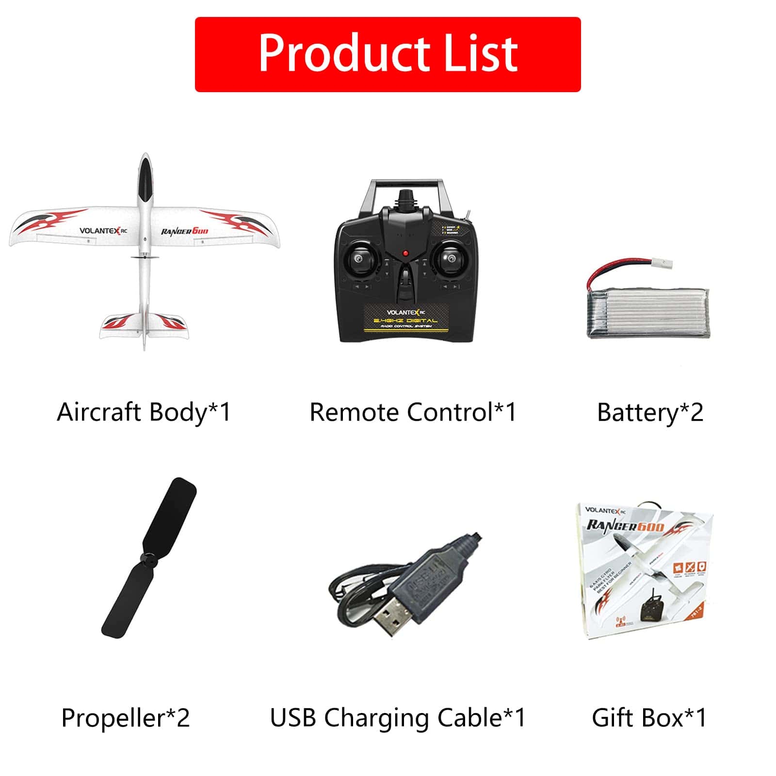 5. AVIÓN DE CONTROL REMOTO LISTO PARA VOLAR Viene con avión, transmisor, baterías de avión y algunas piezas de repuesto, solo requiere 4 pilas AA para el transmisor. Está completamente ensamblado para despegar el avión rc rápidamente y la caja de embalaje portátil te ayuda a llevarlo a todas partes fácilmente.