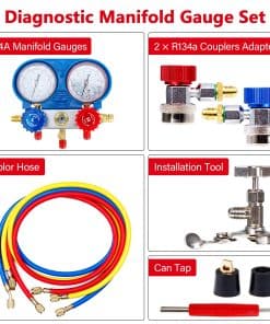 Este es nuestro nuevo juego de manómetro de A/C diseñado para probar sistemas de aire acondicionado automotriz comparando la lectura de presión «alta» y «baja» con las especificaciones del sistema de A/C del fabricante del vehículo. Es adecuado para utilizar solo refrigerante R134A y se puede utilizar para probar, evacuar y llenar sistemas de aire acondicionado automotriz.