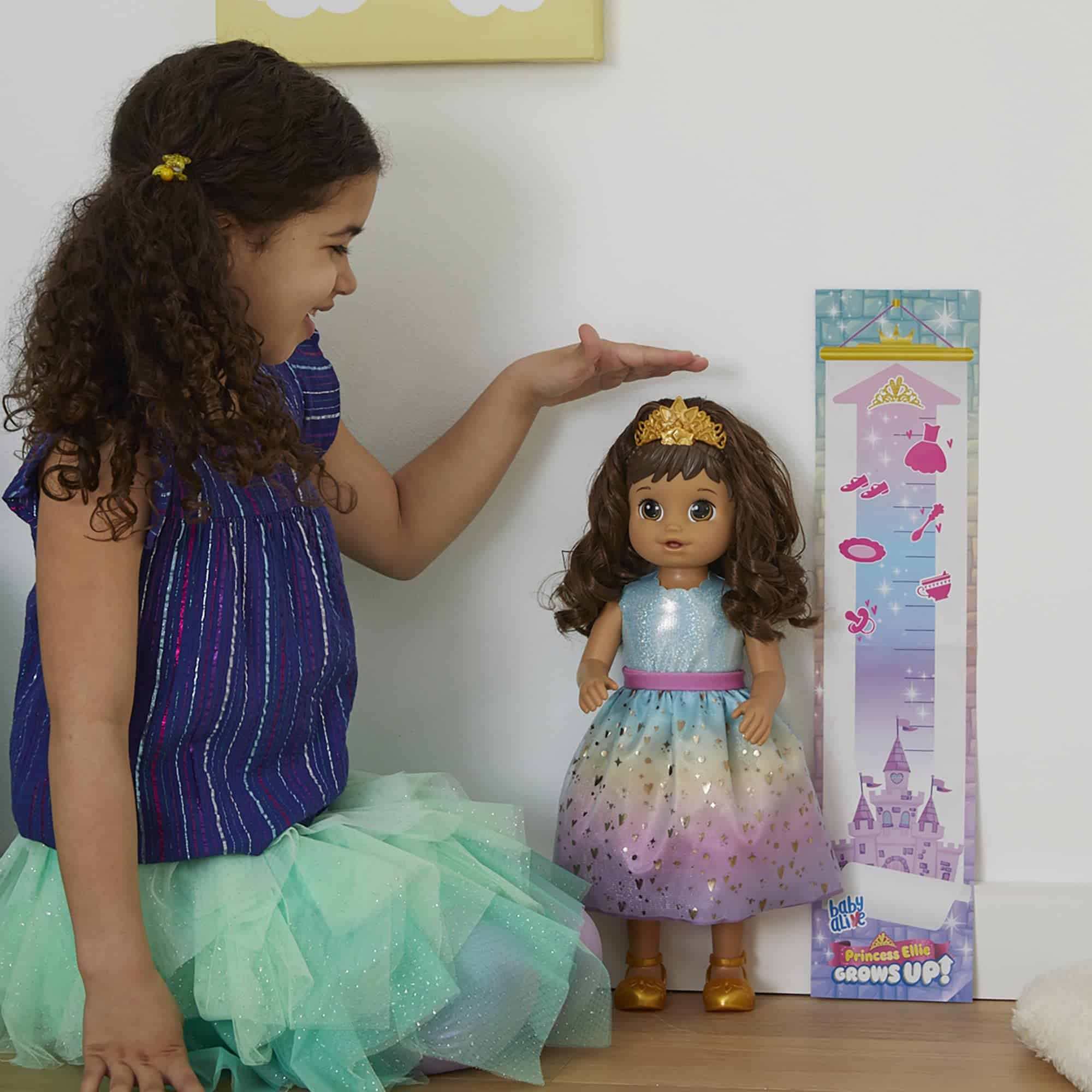 ¿Cuándo se convertirá en una princesa hermosa Baby Alive Princess Ellie Grows Up! es una muñeca Baby Alive que crece! ¡Muñecas fantásticas para niñas y niños de 3 años en adelante! Esta muñeca parlante crece poco a poco con el cuidado de los niños y responde con más de 75 sonidos y frases. ¡Suena un tintineo brillante cuando crece! ¡Como bebé, ella crece lentamente con el balanceo, el uso del chupete y la alimentación simulada con su taza y plato/cuchara! ¡Los movimientos de rebote y la alimentación/beber simulados la ayudan a seguir creciendo! ¡Los niños se divertirán siguiendo su altura con el chart de crecimiento incluido y estilizándola con la ropa de muñeca Baby Alive y los accesorios de Baby Alive! ¡Coloca su extensión de cabello de tiara cepillable en su cabeza y pon la falda de princesa sobre su outfit para completar su look real! ¡Las instrucciones y la guía de inicio rápido ayudan a los niños a cuidar de su muñeca creciente y restablecerla para volver a jugar! ¡Estas muñecas Baby Alive que crecen son juguetes emocionantes de princesa para niñas y niños de 3 años en adelante y son unos regalos geniales para los niños! Baby Alive y todas las propiedades relacionadas son marcas comerciales de Hasbro.