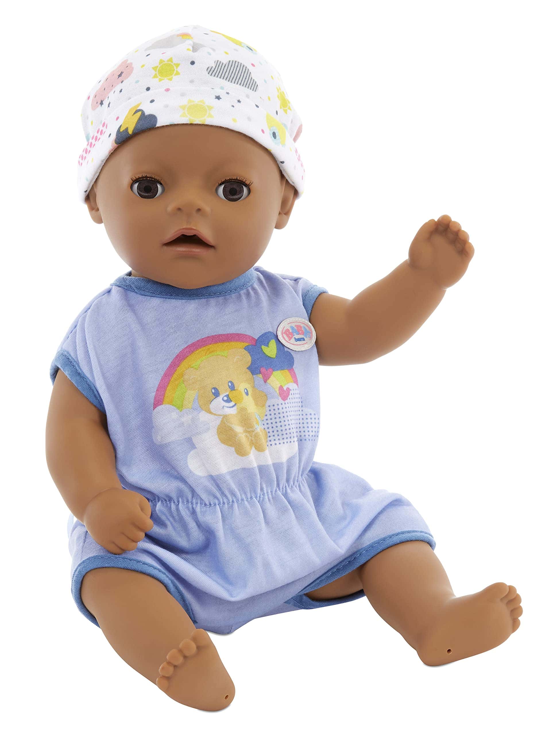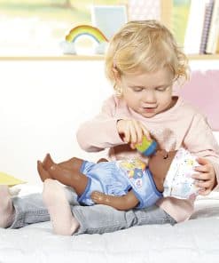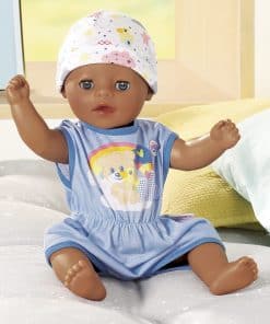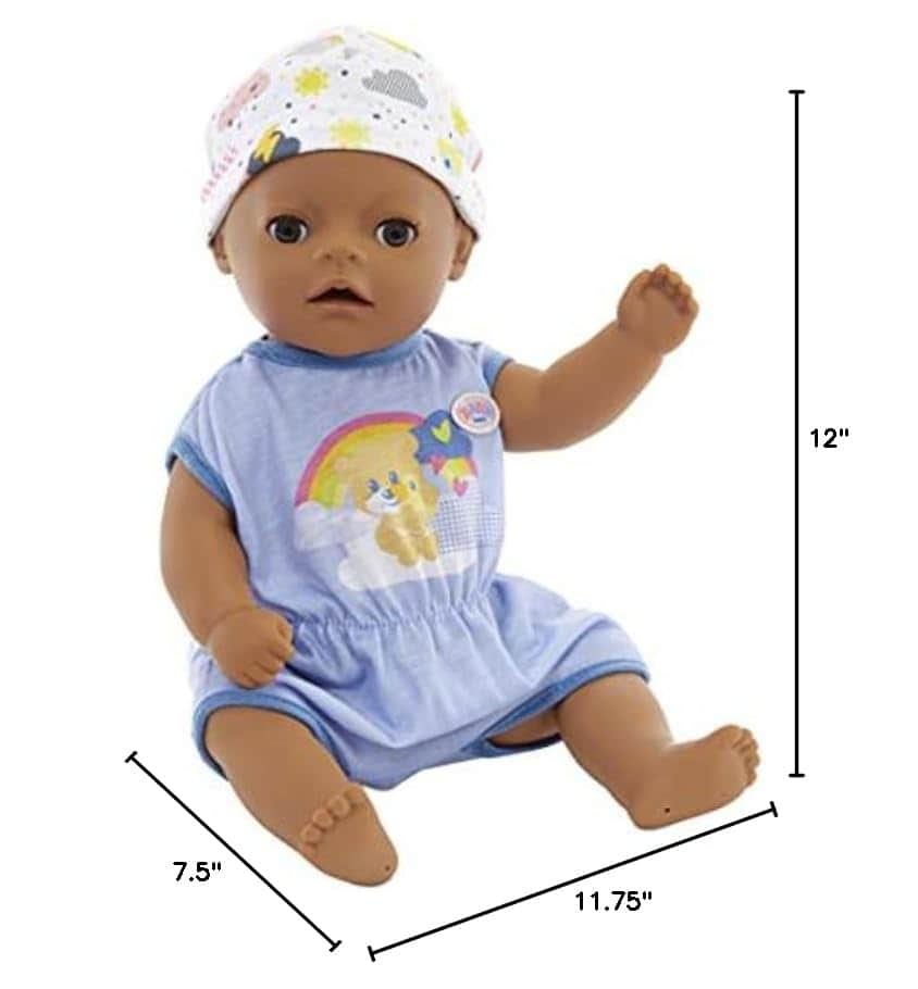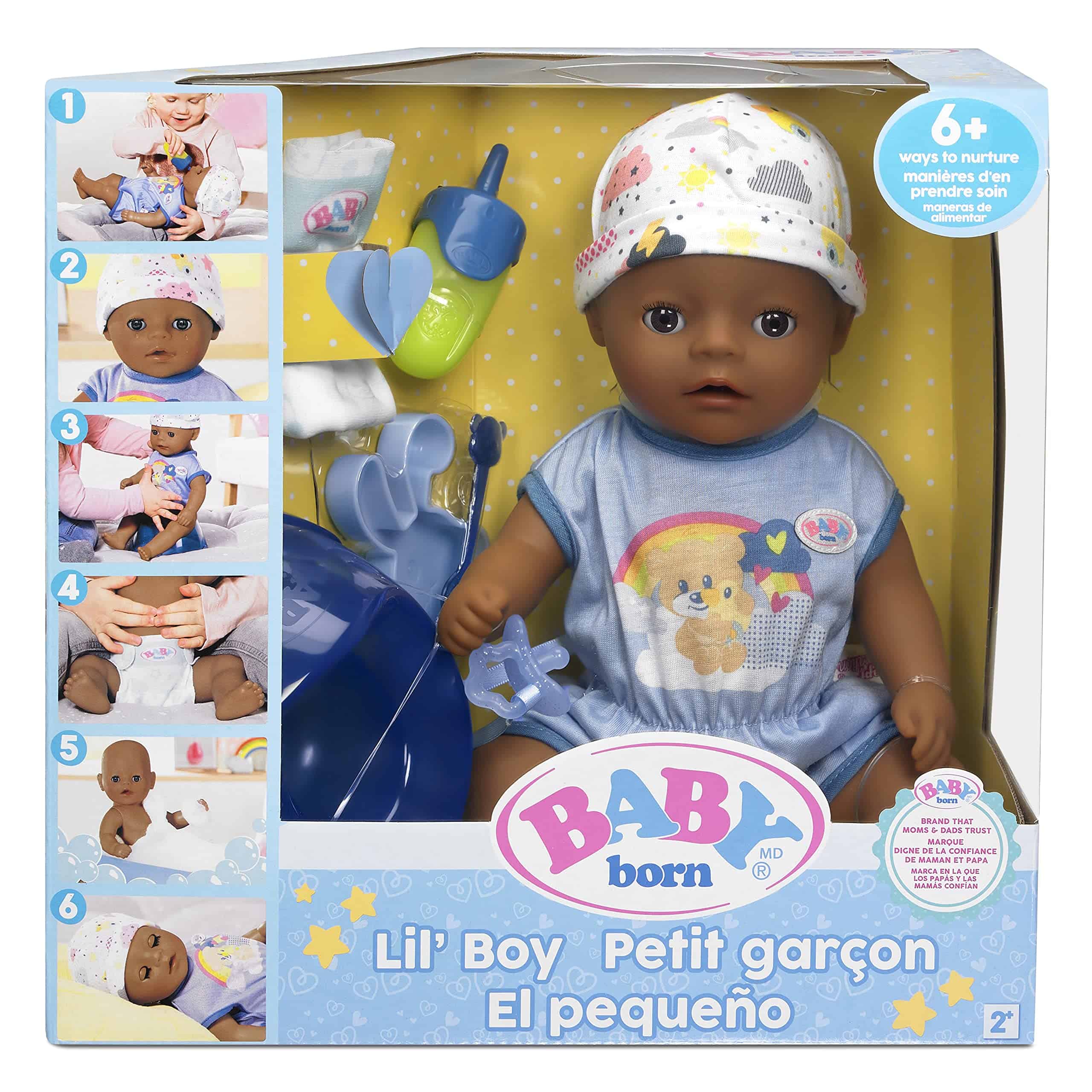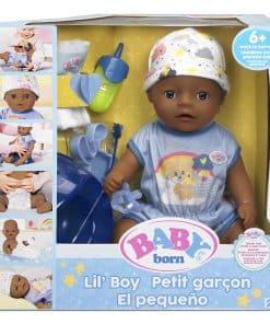 Baby Born ha tocado los corazones de millones de niños en todo el mundo, haciéndolos orgullosos padres de muñecas. Disfruta de un bebé propio con el Baby Born Muñeco de Bebé Interactivo. Este muñeco Lil Boy ofrece un montón de juego imaginativo para los más pequeños de 2 años en adelante. La versión más pequeña de nuestro muñeco Baby Born Boy viene con más de 6 funciones, incluyendo beber agua, llorar lágrimas, hacer pipí y tomar un baño, por lo que es muy divertido para las pequeñas mamás y papás. También tiene brazos y piernas flexibles para que pueda sentarse y cambiarse de ropa fácilmente. Cuando está cansado, los pequeños pueden acostarlo y ver cómo se le cierran los ojos. El Muñeco Little Boy de Tacto Suave lleva un adorable enterizo azul con estampado de oso, nube y arcoíris, con gorro a juego. También incluye un orinal, pañal, biberón, plato con cuchara, chupete y certificado de nacimiento. No se necesitan pilas. Apto para niños de 2 años en adelante.