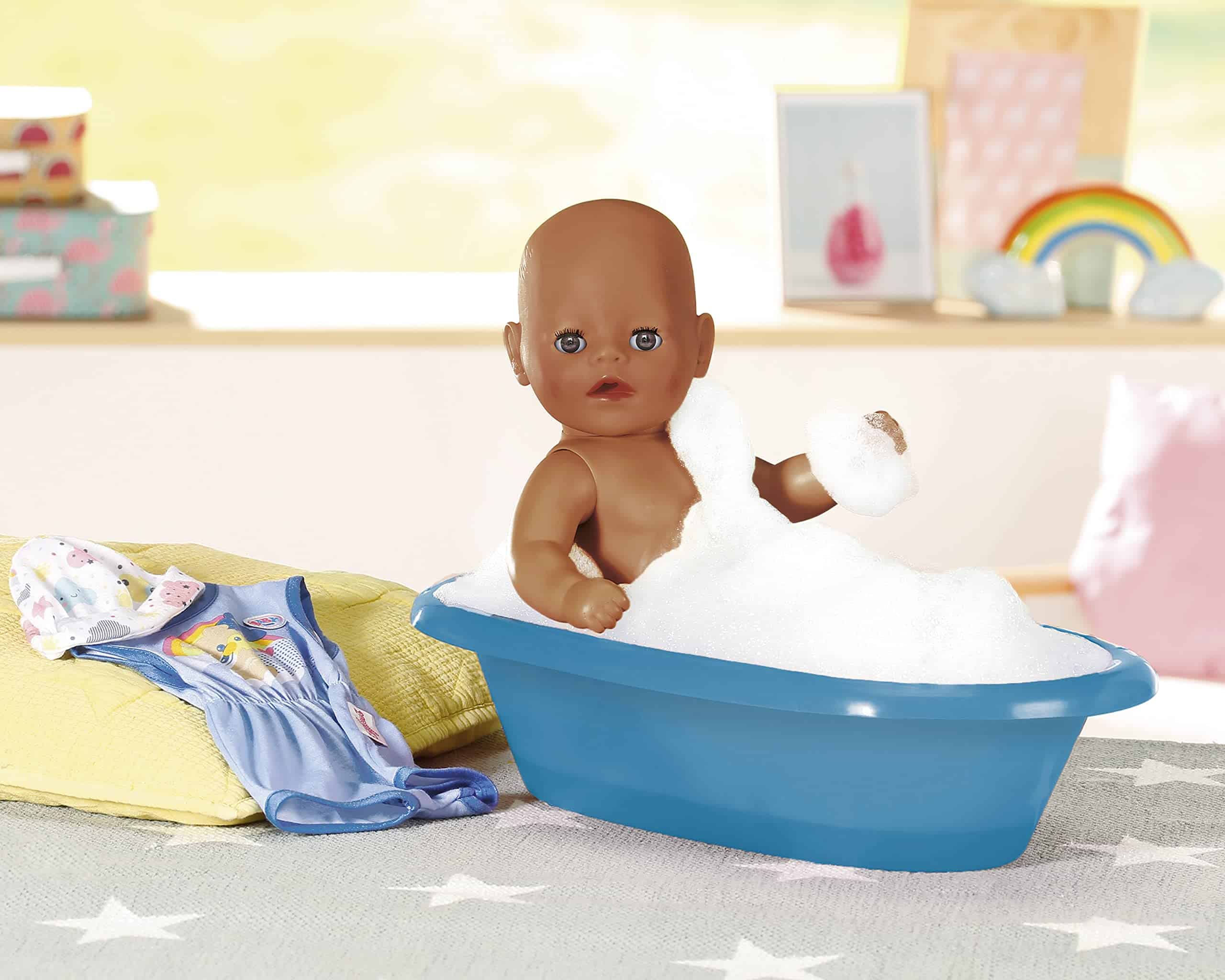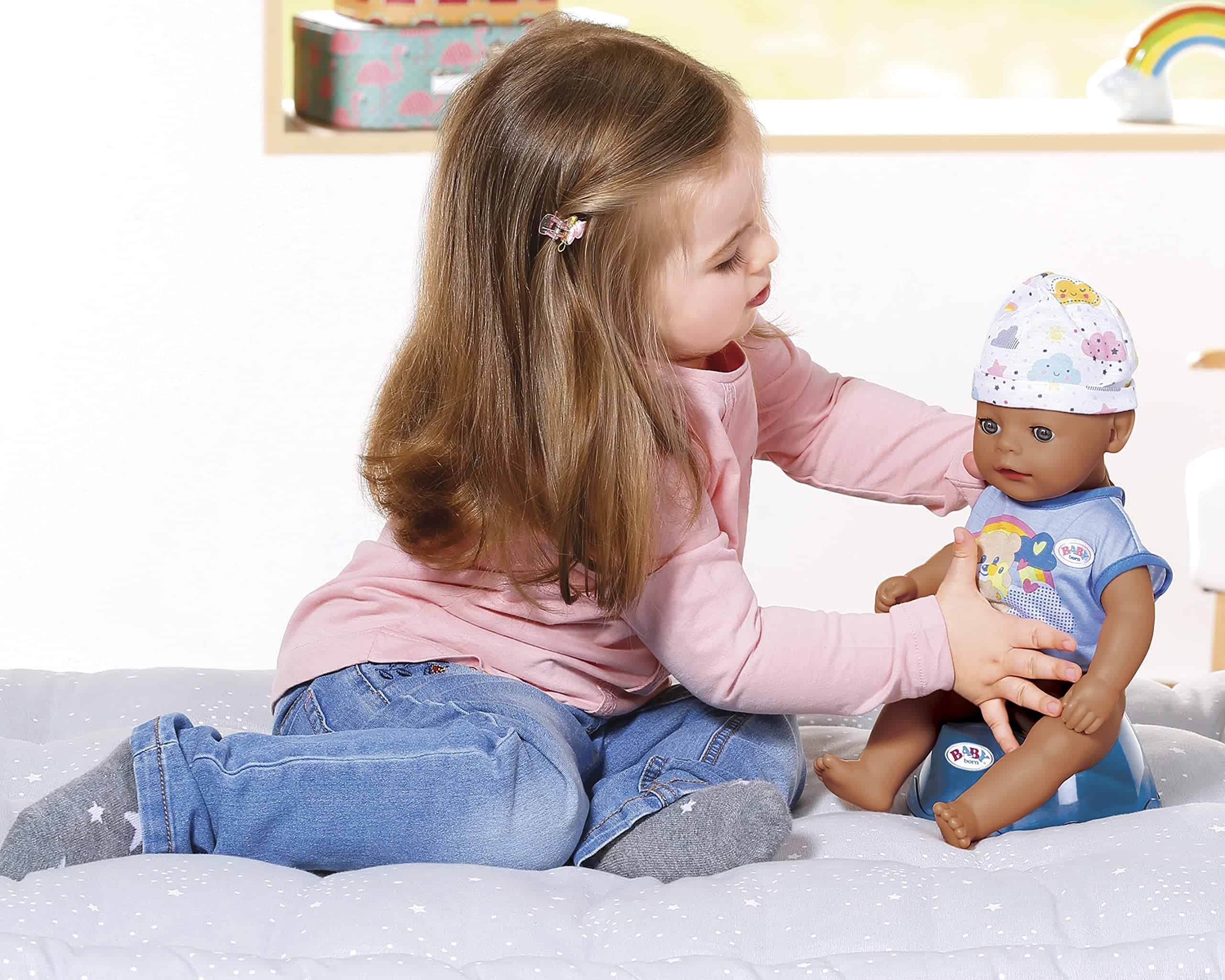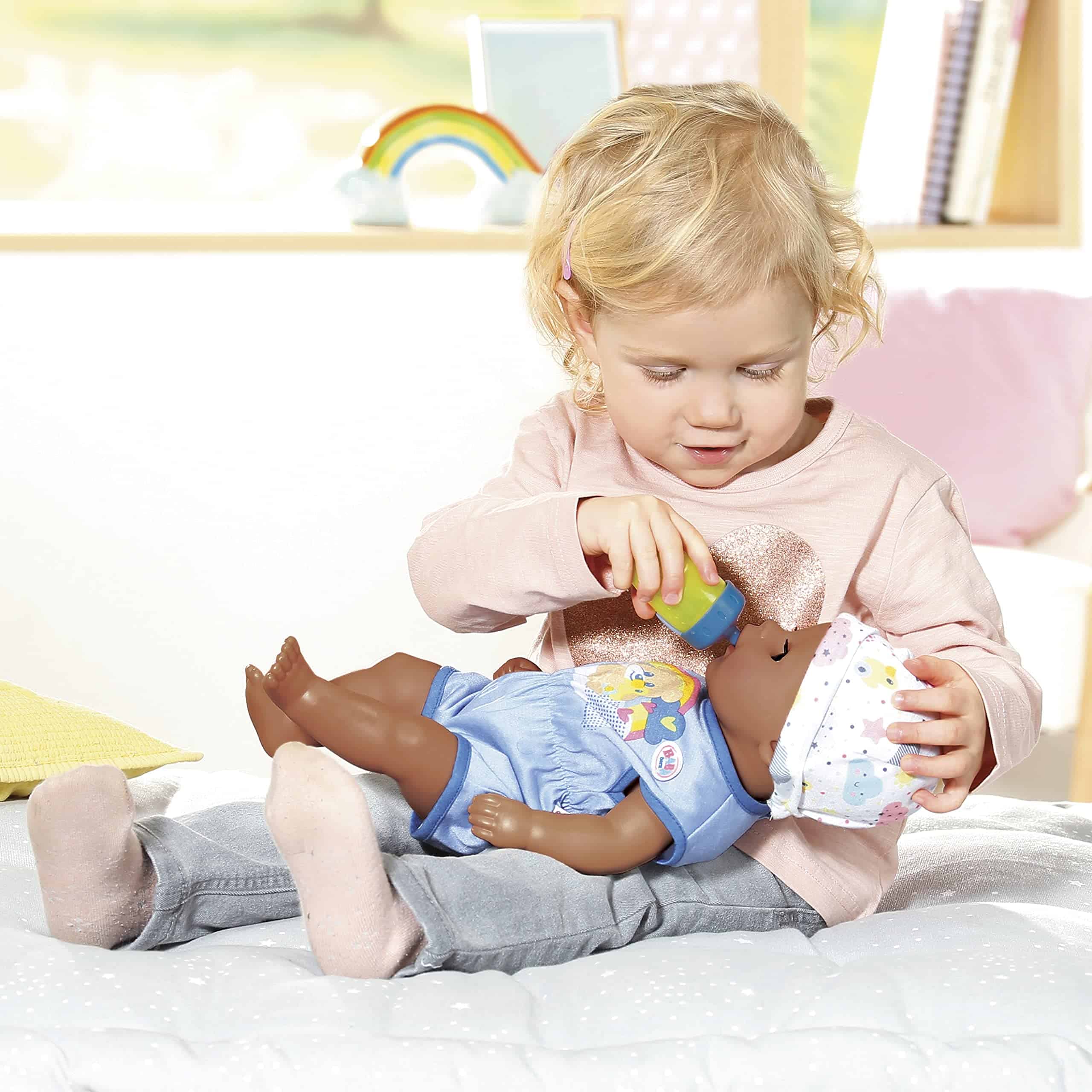 Baby Born ha tocado los corazones de millones de niños en todo el mundo, haciéndolos orgullosos padres de muñecas. Disfruta de un bebé propio con el Baby Born Muñeco de Bebé Interactivo. Este muñeco Lil Boy ofrece un montón de juego imaginativo para los más pequeños de 2 años en adelante. La versión más pequeña de nuestro muñeco Baby Born Boy viene con más de 6 funciones, incluyendo beber agua, llorar lágrimas, hacer pipí y tomar un baño, por lo que es muy divertido para las pequeñas mamás y papás. También tiene brazos y piernas flexibles para que pueda sentarse y cambiarse de ropa fácilmente. Cuando está cansado, los pequeños pueden acostarlo y ver cómo se le cierran los ojos. El Muñeco Little Boy de Tacto Suave lleva un adorable enterizo azul con estampado de oso, nube y arcoíris, con gorro a juego. También incluye un orinal, pañal, biberón, plato con cuchara, chupete y certificado de nacimiento. No se necesitan pilas. Apto para niños de 2 años en adelante.