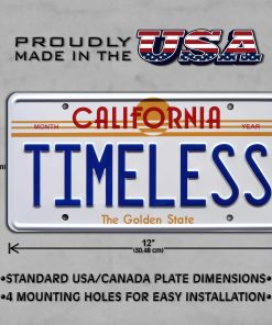 La placa de matrícula blanca de California OUTATIME se produce tal como se ve en el DeLorean Time Machine del Doc Brown en la película Regreso al Futuro. Incluido con la placa está el kit de calcomanías reflectantes correcto de California 1986 y agosto. La placa de matrícula California TIMELESS se produce tal como se ve en uno de los muchos DeLorean Time Machines que aparecieron en la serie de la expedición Expedition Unknown del 2021 Expedition: Back to the Future. Descargo de responsabilidad: Esta es una placa de vanidad decorativa destinada solo para fines de exhibición, coleccionables y de novedad. No es una placa de matrícula registrada. Esta placa no debe utilizarse como reemplazo de una placa de matrícula emitida por el gobierno en ningún vehículo motorizado. El uso indebido de este producto puede infringir las leyes y regulaciones locales.