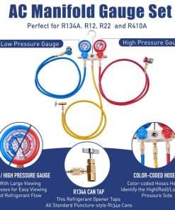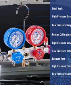 1. Manómetro de 2 válvulas con vista de vidrio y accesorios de 1/4″ SAE, cuerpo de bloque de aluminio anodizado, vista de vidrio sobredimensionada para una fácil visualización del flujo de refrigerante, manómetro de acero inoxidable de alta calidad y alta precisión de lectura.