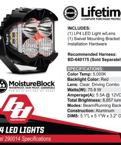 El LP4 es la variante más pequeña en la línea LP y utiliza la misma arquitectura de diseño que sus hermanos mayores. El LP4 cuenta con un total de 8,857 lúmenes brutos, generando 6,885 lúmenes brutos proyectados hacia adelante y 1,972 lúmenes brutos de iluminación periférica dedicada gracias a nuestra patentada Tecnología Periférica Integrada (IPT) que proporciona un haz de luz de 200 grados que ilumina las zonas 1, 2 y 3, llegando incluso a la zona 4 spot. Para mantener tu luz funcionando a su nivel más alto, el LP4 integra nuestra tecnología de Enfriamiento Directo y Ducted (DDC) propia que permite que el aire viaje a través del frente de la carcasa y sobre los disipadores de calor traseros, mejorando drásticamente la capacidad de enfriamiento y rendimiento. La adición de opciones de retroiluminación en rojo, azul o verde junto con nuestro ámbar original en el LP4 Pro da a los entusiastas la opción de personalizar su vehículo para exhibiciones, sesiones de fotos o en cualquier lugar donde quieran llamar la atención. Respaldado por nuestra Garantía de Satisfacción de 30 Días y Garantía Limitada de Por Vida para la máxima protección en la compra. NOTA: Esta luz no viene con un arnés de cables. El arnés de cables aplicable para esta luz es el 640175.