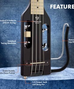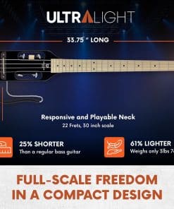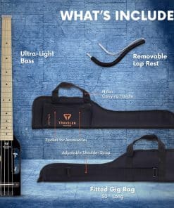 Finalmente un bajo que puedes llevar contigo. El Ultra-Light Bass es la opción de bajo más ligera y compacta de Traveler Guitar hasta la fecha. Con un peso de menos de 3 1/2 libras y midiendo solo 33 3/4 pulgadas de longitud, este bajo acústico-eléctrico de escala corta de 30 pulgadas puede ir a donde quieras llevarlo. El Sistema de Afinación In-Body patentado utiliza máquinas de afinación estándar reubicadas en el cuerpo, eliminando la necesidad de un clavijero. Como resultado, tendrás la misma experiencia de juego a la que estás acostumbrado en un instrumento que es un 25% más corto y un 61% más ligero que un bajo de tamaño normal. El Ultra-Light Bass cuenta con una pastilla piezoeléctrica personalizada para que puedas conectarla a tu amplificador favorito, mientras que el reposapiés incorporado y el marco desmontable para apoyar la guitarra en el regazo te permiten tocar cómodamente, incluso en los espacios más pequeños. El Ultra-Light Bass es la solución perfecta para los músicos viajeros que no quieren comprometer la calidad de reproducción, pero que aún buscan una solución pequeña y ligera. Este es un bajo ideal para llevar en cabina, ya que se guarda fácilmente en los compartimentos superiores de los aviones en su estuche de lujo incluido.
