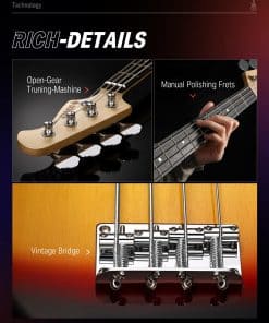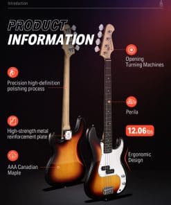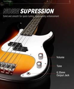 Este paquete de bajo eléctrico Donner DPB-510S de tamaño completo incluye todos los accesorios que necesitas para empezar a tocar desde el primer momento. El paquete incluye el bajo eléctrico Donner DPB-510S, una buena calidad de bolsa de transporte, cable de guitarra y correa. ¡Ahorra tiempo y dinero con este paquete de bajo todo en uno! El DPB-510S cuenta con un cuerpo sólido de tilo con finas arqueaduras, clavijas cromadas, cuerdas de latón de buena calidad y una placa de protección de PVC. Las clavijas de afinación están hechas de acero para facilitar la afinación y mantener la cuerda afinada en posición. No solo tiene todo lo que necesitas para aprender y tocar el bajo, sino que también tiene un precio tan asequible que no requiere una gran inversión. El DPB-510S ofrece un tono suave ideal para el rock and roll, tocar blues y mucho más. ¡La naturalidad y el brillo del sonido complementan los cálidos sonidos de la madera sólida! ¡Únete a la creciente moda de la guitarra y disfruta de tu propia vida divertida y colorida! Nota: Si no recibiste algún artículo, contáctanos y te enviaremos los artículos lo antes posible. Especificaciones: Color: Sunbusrt Tamaño: Tamaño completo Longitud de escala: 34″ Orientación de la mano: Derecha Pastillas: pastillas-bajo Controles: 2V Material del cuerpo: tilo africano AAA macizo Material del mástil: arce canadiense AAA Forma del mástil: Forma «C» Incrustaciones de posición: puntos Incluye trastes: 21 Clavijas de afinación: Acero fundido Número de cuerdas: 4 Ancho de cejuela: 1.656 in. (42 mm) Paquete incluido: 1 x DPB-510S Bajo eléctrico de 4 cuerdas 1 x Cable de guitarra 1 x Estuche grande 1 x Correa de guitarra
