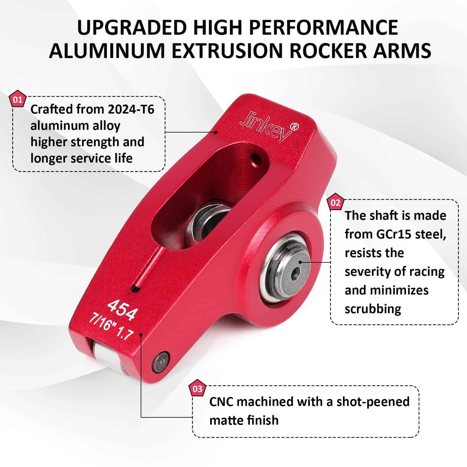 1. Material de Alta Precisión: Hechos de aleación de aluminio 2024-T6, estos balancines de alto rendimiento están especialmente diseñados para motores callejeros de alto rendimiento y de carreras; El material es ideal para aplicaciones que requieren una integridad estructural excepcional mientras se minimiza el peso; En comparación con otros balancines de aleación de aluminio, esta aleación en particular demuestra una resistencia superior a la fatiga y conductividad térmica, lo que la hace ideal para soportar ciclos repetidos de carga y descarga.
