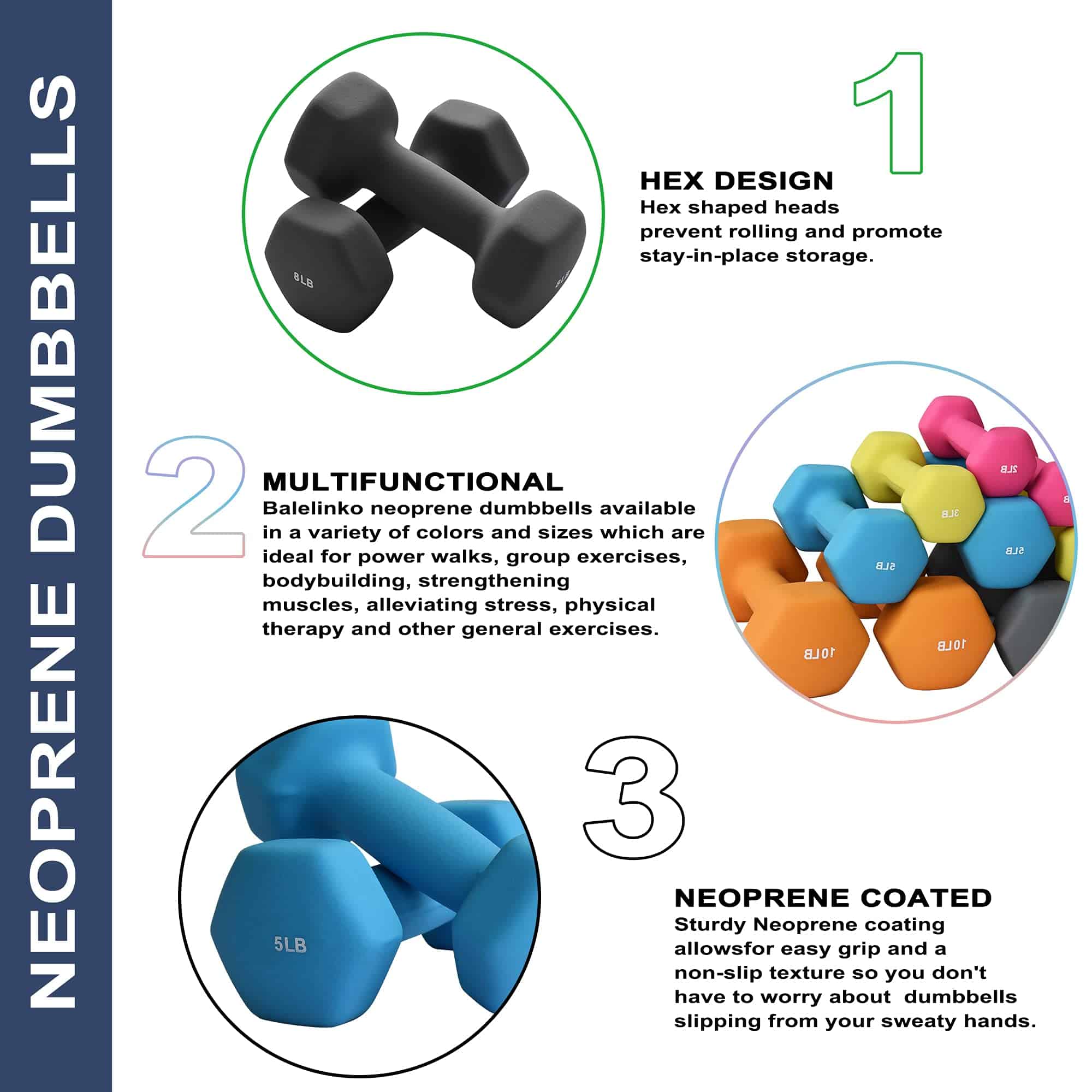 1. PESAS HEXAGONALES DE NEOPRENO: Estas pesas hexagonales de neopreno están diseñadas para mantenerse en su lugar, evitando que rueden y protegiendo sus pisos de daños y agrietamientos. Fabricadas en hierro fundido resistente, son perfectas para levantamiento de peso ligero y tonificación muscular.