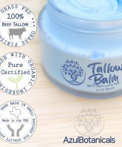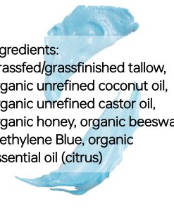 Infusionado con azul de metileno, un antioxidante poderoso, este bálsamo de sebo de vaca alimentada con pasto es una solución natural y efectiva para una variedad de problemas de la piel. Con ingredientes orgánicos de calidad premium, incluyendo vitaminas esenciales A, D, E y K, este bálsamo ofrece hidratación profunda, alivio de afecciones cutáneas comunes y propiedades rejuvenecedoras anti envejecimiento. Perfecto para todo tipo de piel, este bálsamo es seguro y natural, sin químicos o aditivos dañinos. Disfruta de una piel suave, saludable y radiante con este bálsamo de sebo multifuncional.
