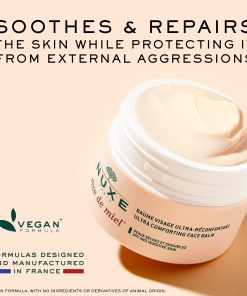 Bálsamo facial ultra reconfortante de Nuxe Rêve de Miel, una crema nutritiva diseñada especialmente para pieles secas y sensibles. Contiene Miel, Propóleo y Aceites Preciosos que proporcionan una nutrición intensa, calman y reparan la piel, así como la protegen del viento, frío y otras agresiones externas. Con un 92% de ingredientes de origen natural y fabricado en Francia, esta crema restaura la suavidad y comodidad de la piel, reduciendo la rugosidad y enrojecimiento.