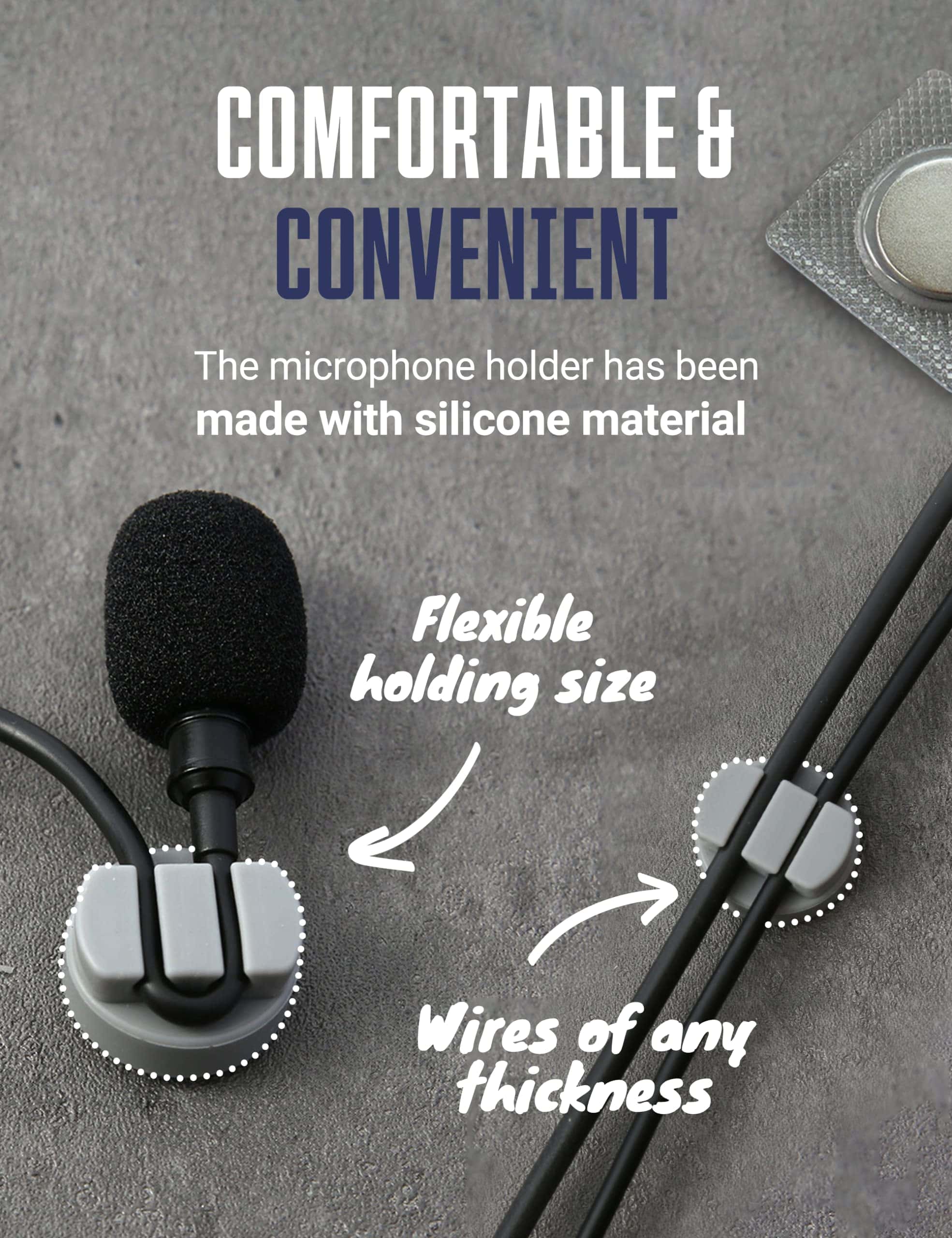 1. FLEXIBLE SILICONA. El soporte magnético está diseñado con un material de silicona flexible que permite adaptarse a cables de cualquier tamaño, desde cables de micrófono gruesos hasta delgados. Esto significa que no tienes que preocuparte por encontrar el soporte con el tamaño correcto para tu cable o lidiar con un soporte que no encaje correctamente.