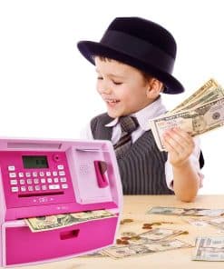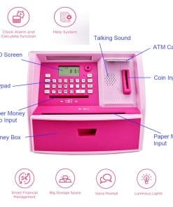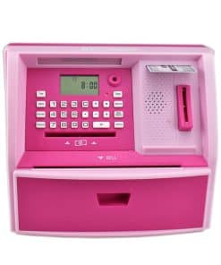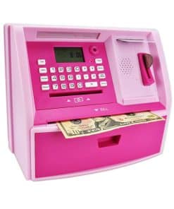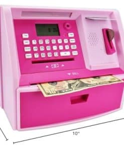 Este banco ATM parlante ayuda a los niños a aprender el manejo del dinero mientras mantienen una cuenta de ahorros. La máquina acepta depósitos de monedas y billetes reales de hasta $999.99 y muestra información precisa y actualizada de la cuenta en su pantalla. Los titulares de la cuenta interactúan con el cajero a través del panel de control y tienen su propia tarjeta ATM y PIN para consultar el saldo de su cuenta, hacer depósitos o retirar fondos. Preferido por un panel de padres y niños, este modelo fue confirmado como el mejor en pruebas. Tiene un teclado grande y claramente etiquetado para una fácil operación, a diferencia de modelos inferiores con botones pequeños y marcas confusas. Incluye un reloj digital con alarma. Solo para moneda estadounidense. Requiere tres pilas AA. Para edades de 5 años en adelante. Garantía de un año.