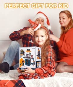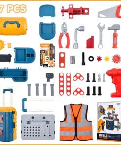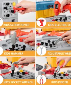 1. Juego de herramientas multifuncionales para niños que incluye chaqueta de ingeniería de tamaño infantil, sierra, martillo, alicates, llave, destornillador y taladro eléctrico que funciona con batería! El banco de trabajo para niños brinda experiencias reales que mejoran las habilidades prácticas de los niños.