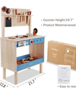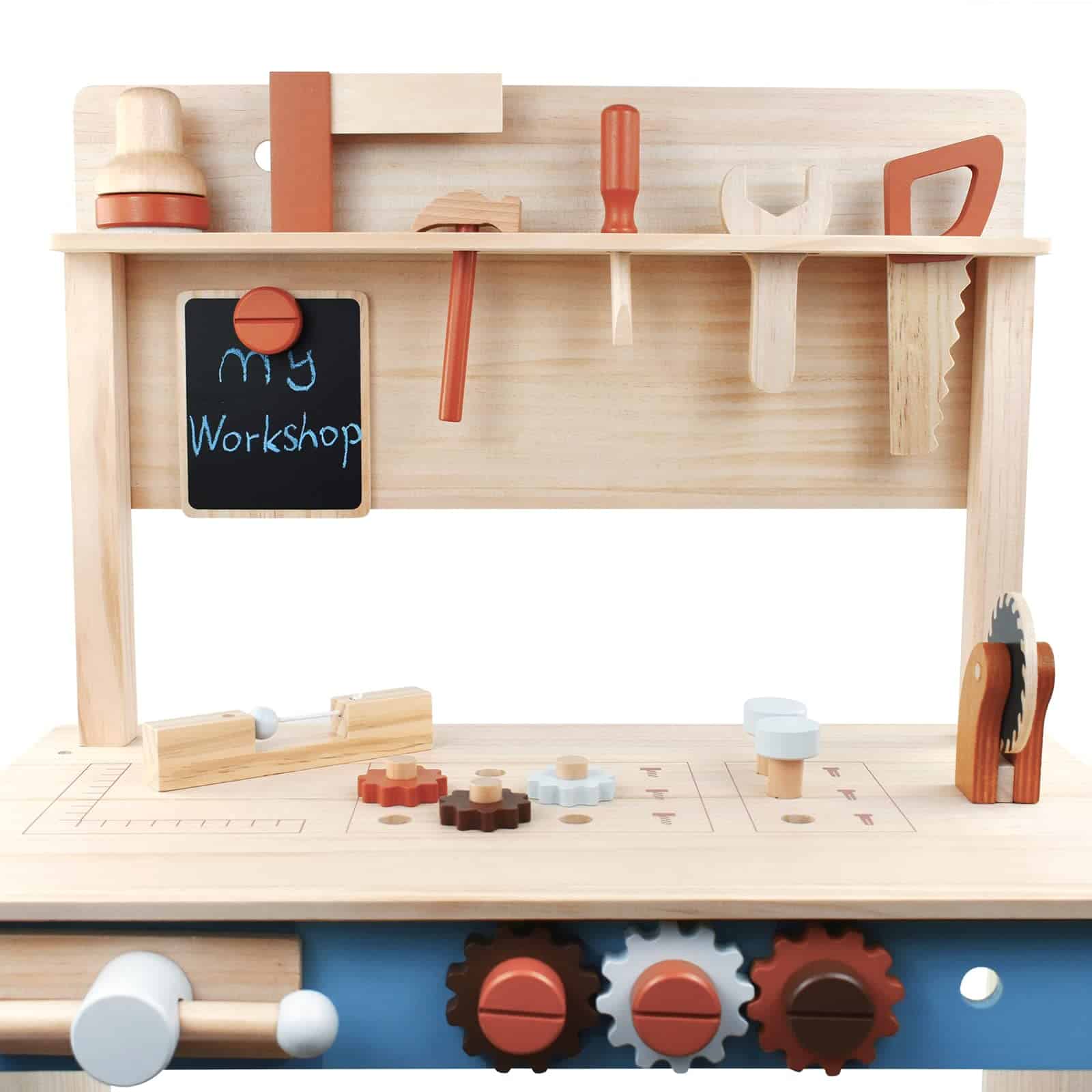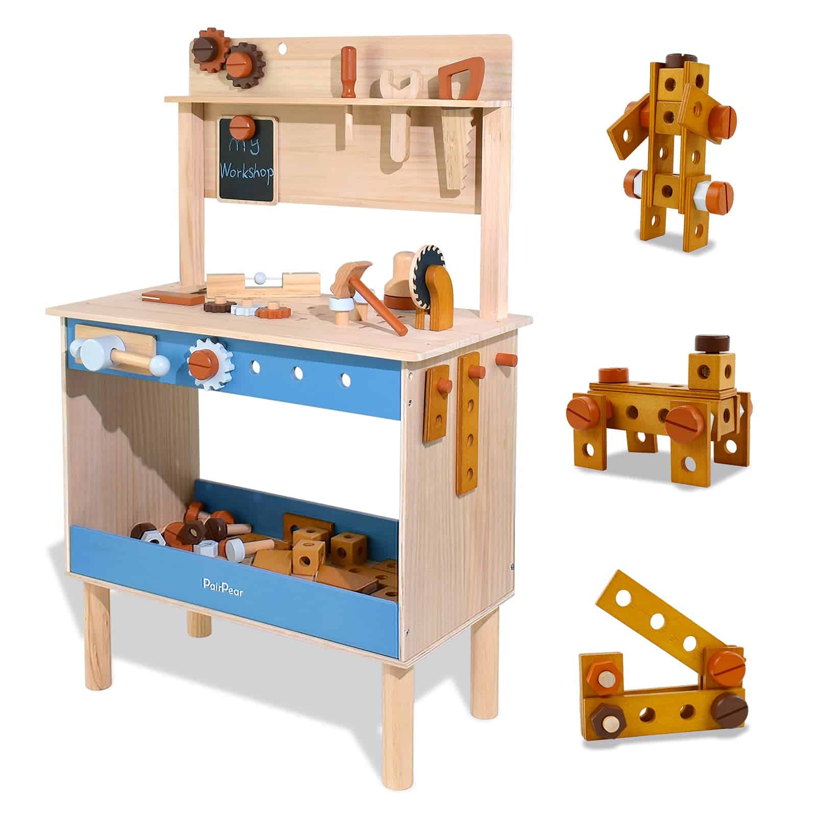 1. Banco de trabajo de juguete de madera para niños: todo hecho de madera de alta calidad, este banco de trabajo de tamaño infantil incluye una sierra de juguete segura, martillo, llave inglesa, taladro, destornilladores y más. Gran juguete para enseñar a los niños a usar herramientas y lecciones de seguridad.