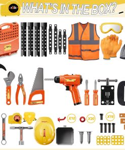 Nuestro juego de herramientas de construcción para niños incluye un chaleco de seguridad, gorra, gafas, máscara protectora, guantes, taladro eléctrico, martillo, llave ajustable, alicates, torno de máquina, sierra de mano, destornillador Phillips, destornillador ranurado, llave en forma de T, cinta métrica, clavos, llave de combinación, llave hexagonal, abrazadera en forma de C, bloqueo de madera, tuercas, tornillos, placas de bloqueo, ganchos y caja de herramientas. Todo es totalmente funcional y realista, ¡sus hijos estarán ocupados jugando con varias herramientas!