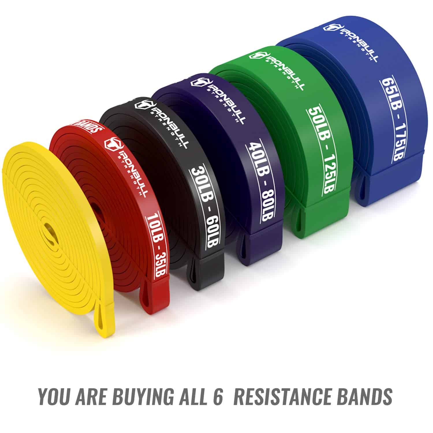 – 5 tamaños diferentes para todos los niveles de fitness (1 Rojo – 10 a 35 lbs, 2 Negro – 30 a 60 lbs, 3 Morado 40 a 80 lbs, 4 Verde 50 a 125 lbs, 5 Azul – 65 a 175 lbs)