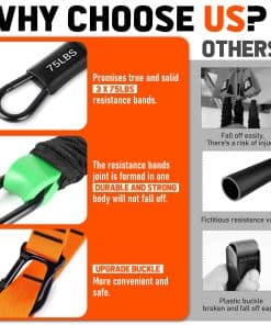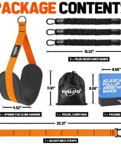 1. Juego completo de bandas de asistencia para dominadas – El juego de bandas auxiliares para dominadas está equipado con correas ajustables, bandas de resistencia elástica de 375lbs y 1 almohadilla de eslinga con tirantes de esponja colgantes. Puedes ajustar fácilmente 3 niveles de resistencia de las bandas de 75lb a 225lb de ayuda, lograr el propósito de ejercitar todo el cuerpo según diferentes combinaciones.
