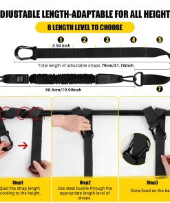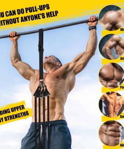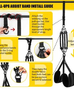 3. Ajuste de la Asistencia para Dominadas Cuelgue las bandas ajustables de asistencia para dominadas en una barra resistente, alargue/corte dependiendo de su altura, si solo necesita una longitud más corta, se recomienda envolver las bandas de asistencia varias veces para aumentar la durabilidad de la cinta. Cuantas más veces envolver las bandas de asistencia, más asistencia para dominadas a las mismas libras. Elija las bandas de asistencia con un soporte de 70-280 libras según su fuerza hasta que pueda completar una dominada solo. Instale el pedal para el pie. Comience el viaje de entrenamiento de dominadas.