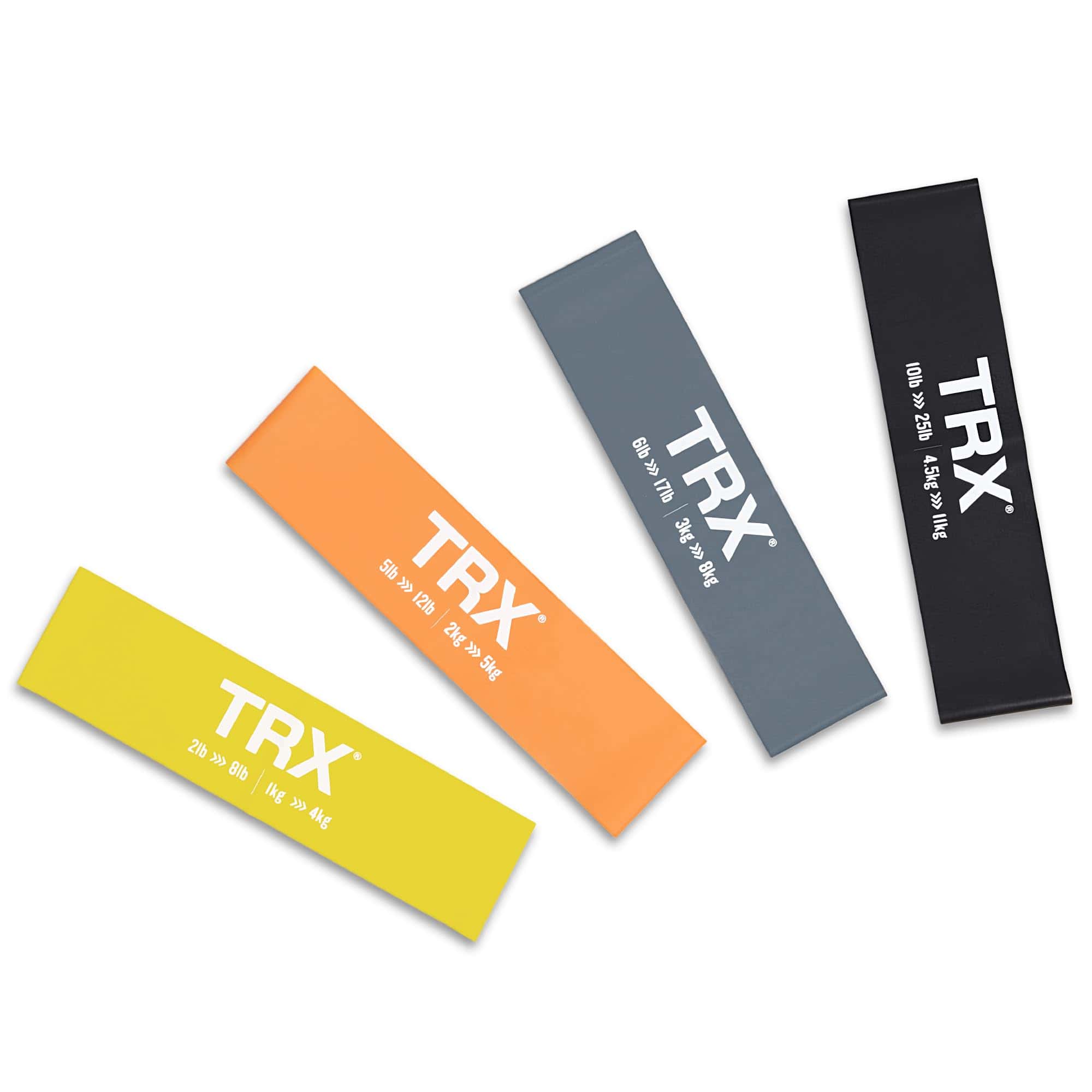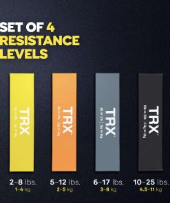 1. ¿QUÉ INCLUYE EL SET? El set de bandas de ejercicio TRX incluye 4 bandas de diferentes rangos de peso para ayudarte a medir tu progreso en el levantamiento: amarilla (28 lbs), naranja (512 lbs), gris (617 lbs) y negra (1025 lbs). Cada banda mide 12″.
