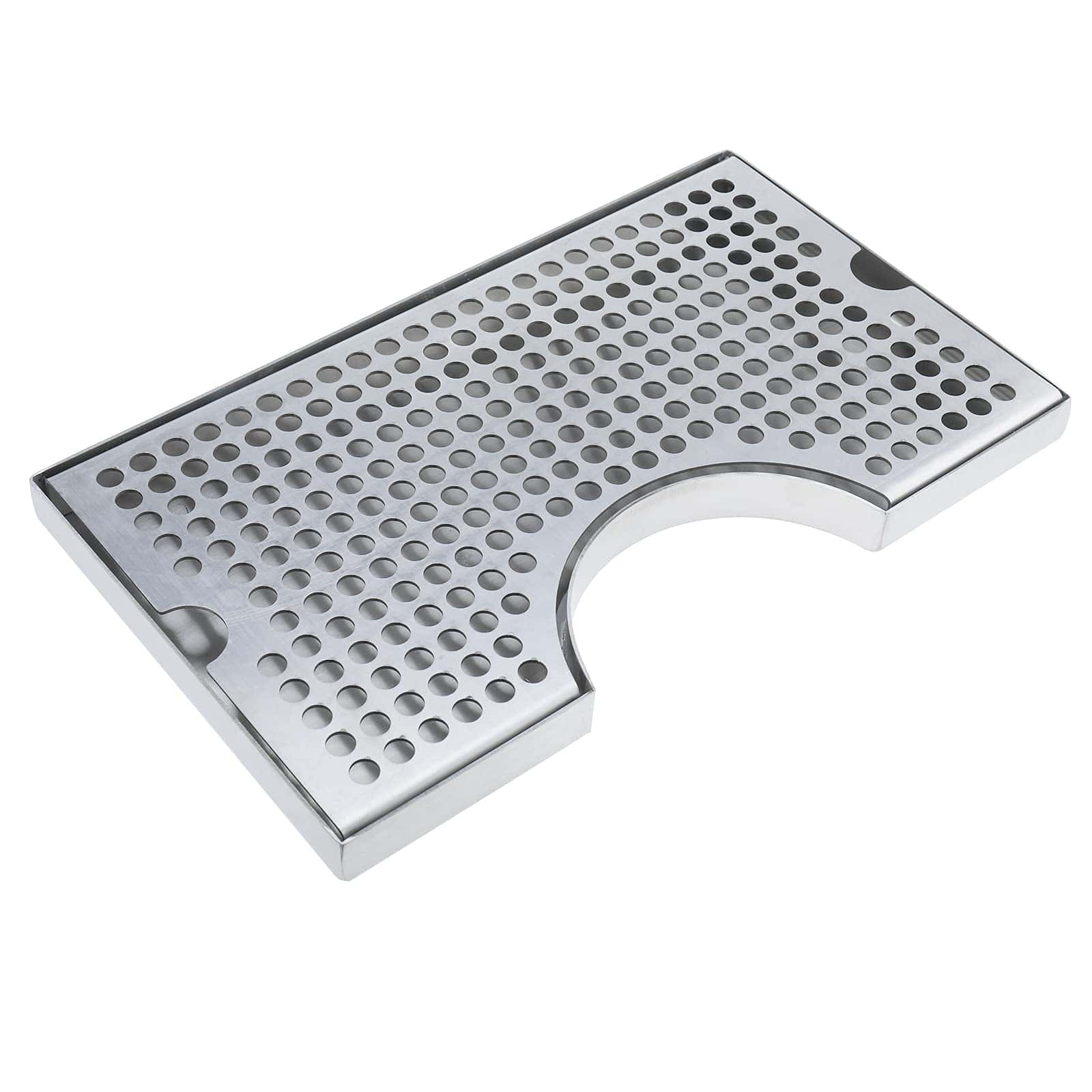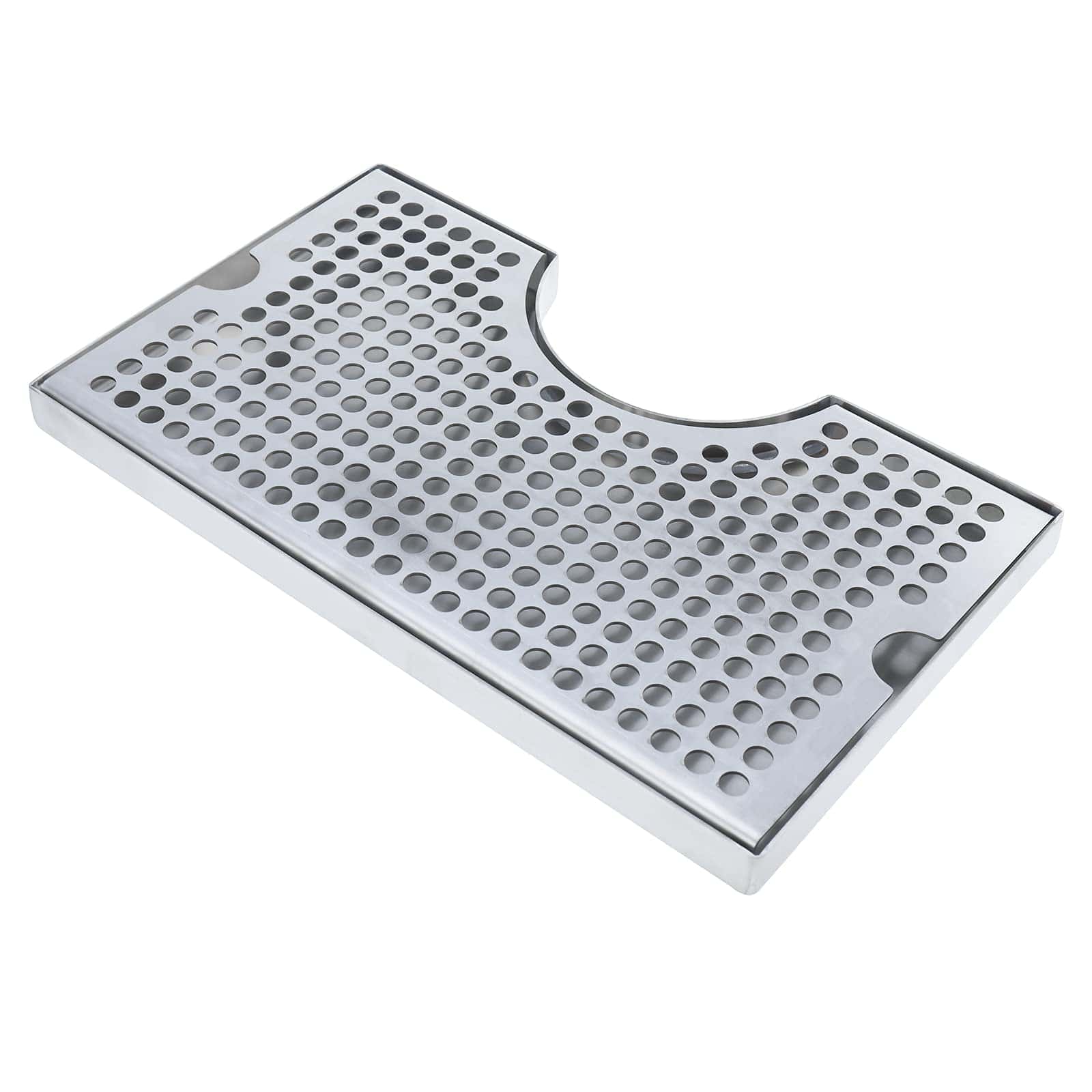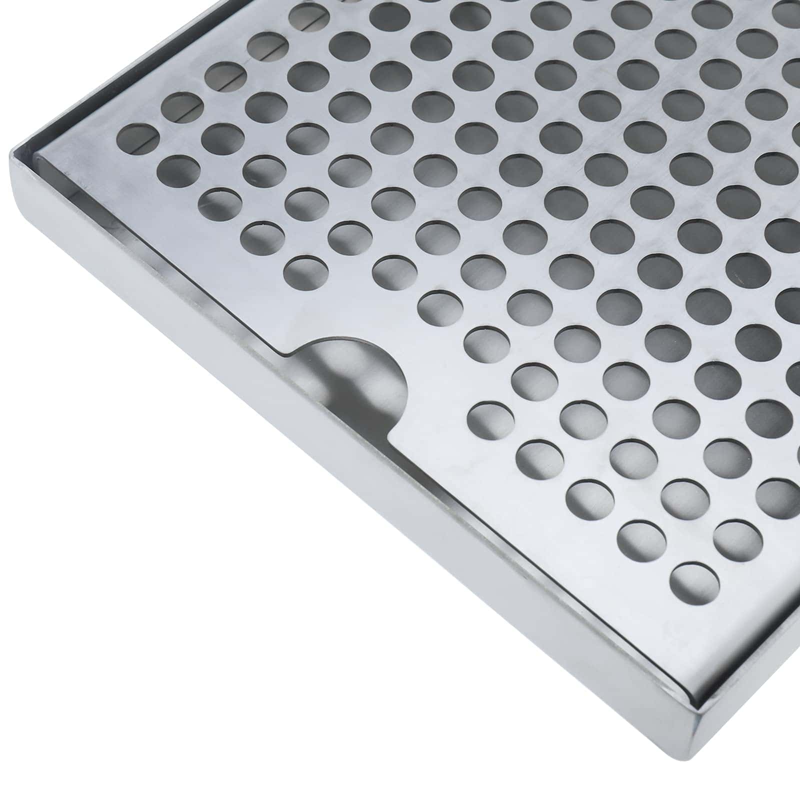 Características de la Bandeja de Goteo Troquelada: 1. Mantén tu bar limpio – La bandeja de goteo se puede utilizar para recoger la cerveza derramada del grifo o dispensador de cerveza, y mantener su encimera un lugar súper limpio y ordenado. Puede usarlo en una encimera de bar o en un kegerator. Ampliamente utilizado para restaurantes, salas de grifo, cocinas y estaciones de bar en casa. 2. Material de alta calidad – Esta bandeja de goteo troquelada está hecha de acero inoxidable de alta calidad resistente a la corrosión y al óxido, con una apariencia elegante y brillante. 3. Fácil de limpiar – Esta bandeja de goteo para cerveza tiene una cubierta extraíble, muy conveniente para la limpieza. Solo necesita vaciar la bandeja y lavarla con agua. Es un accesorio ideal para kegerator o torre de cerveza tanto para interiores como para exteriores. 4. No necesita perforar agujeros – Coloque esta bandeja de goteo troquelada en la parte superior de las encimeras de bar o debajo del grifo para recoger el exceso de líquidos o bebidas. No es necesario perforar agujeros, para no dañar esa maravillosa y costosa encimera. 5. Apto para Brida de Base de Torre de 3″ – El troquelado de esta bandeja de goteo para cerveza tiene una dimensión de 5″ x 1.75″, y la bandeja de goteo tiene una dimensión de 12″ L x 7″ W x 3/4″ H. Esta bandeja de goteo para cerveza troquelada encaja en la base de torre de 3″, la mayoría de las torres de grifo individual, la torre de cerveza de doble grifo y las torres de dispensador de cerveza de triple grifo.