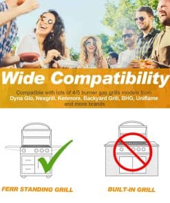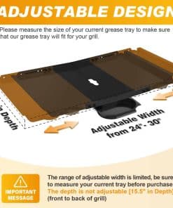 Con el ancho ajustable de 24″ a 30″ que hace que nuestra bandeja de parrilla sea compatible con varias marcas de parrilla, es compatible con Dyna Glo, Nexgrill, Kenmore, Backyard Grill, BHG, Uniflame, etc. La capacidad de recolección de 400ML es también una característica útil que ayudará a reducir la necesidad de limpieza o reemplazo frecuente de la bandeja. Verifique las medidas de su bandeja de parrilla actual antes de comprar para asegurarse de que nuestra bandeja de parrilla se ajuste a su parrilla.