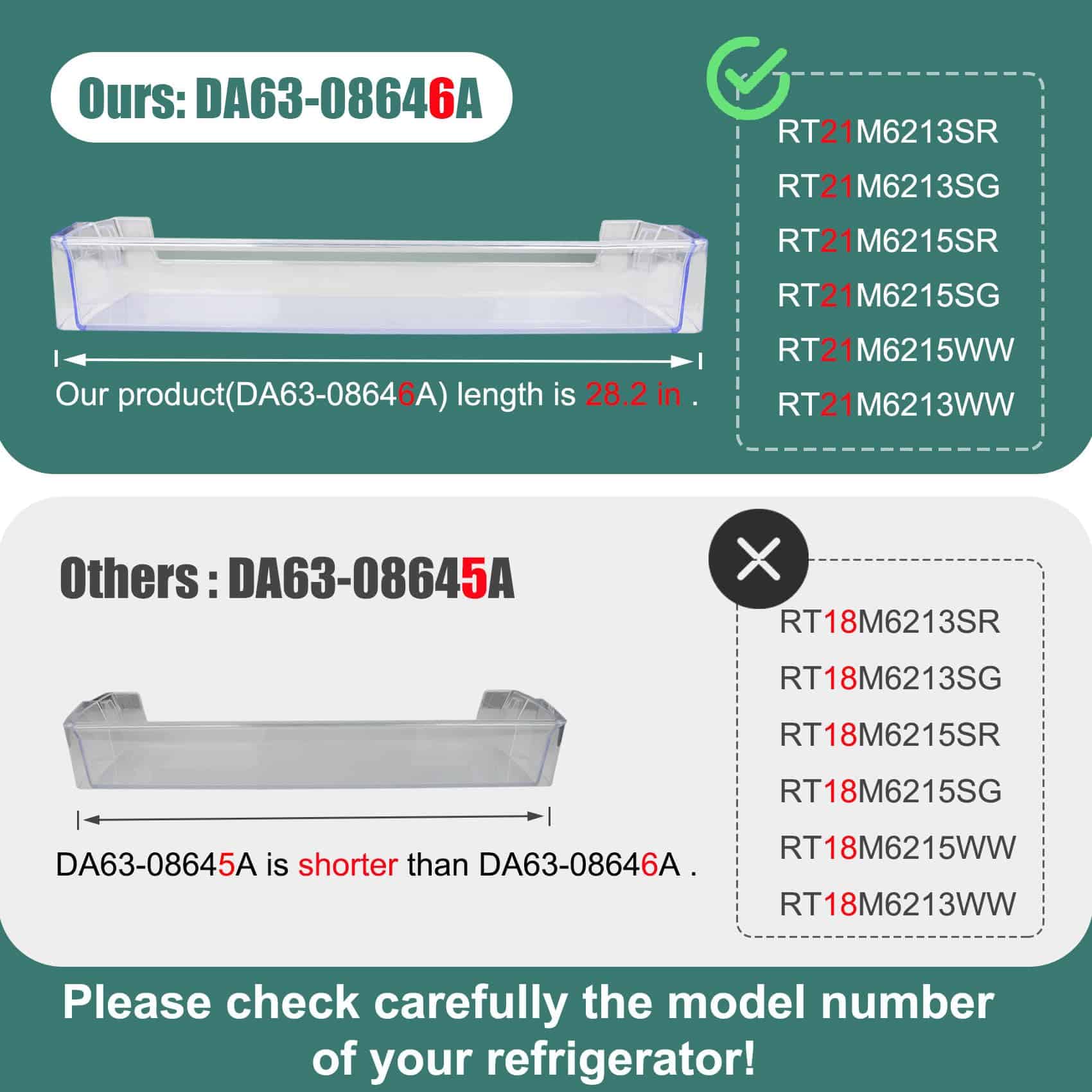 Alta calidad Utilizamos un diseño de material respetuoso con el medio ambiente, sin contaminación, seguro, higiénico, materiales premium y altamente duraderos garantizados para superar las especificaciones OEM. Número de parte DA63-08646A, EAP12082571, PS12082571, AP6241329, 4813761. Solo aplicable a esta parte del modelo, por favor confirme antes de comprar Notas de compra DA63-08646A Adecuado para la parte inferior del refrigerador. El modelo superior es DA63-08648A. Por favor, confirme antes de la compra, Para ahorrarle tiempo Modelo aplicable Compatible con Samsung RT21M6213SG, RT21M6213SR, RT21M6213WW, RT21M6215SG, RT21M6215SR, RT21M6215WW (Compatible con los refrigeradores Samsung mencionados anteriormente) Calidad posventa Para cualquier problema de calidad, se reenviará un nuevo producto o se realizará un reembolso completo incondicional. Garantía de devolución del dinero del 100% – Por cualquier motivo, si no está satisfecho, puede solicitar un reemplazo o un reembolso completo. La satisfacción del cliente es nuestra incansable búsqueda. Si no está satisfecho con el producto, no se apresure a dejar un comentario negativo. ¡Contáctenos! Le mostraremos una actitud sincera y una solución satisfactoria