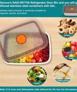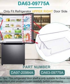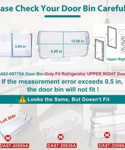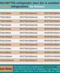 DA63-09775A, DA97-20984A Bandeja de la puerta del refrigerador 100% de garantía de calidad La bandeja de la puerta del refrigerador DA63-09775A de Garsoo está hecha de materiales libres de contaminación, seguros, sanitarios y altamente respetuosos con el medio ambiente. Los materiales están mejorados y espesados, y las especificaciones superan a OEM. La bandeja DA63-09775A es más resistente que la original y no se desgastará ni se romperá fácilmente. La pieza da63-09775a es fácil de instalar, lo que ahorra tiempo y dinero. Repisas de la puerta del refrigerador para Samsung DA63-09775A La repisa de la puerta de Samsung es adecuada para las repisas de la puerta del refrigerador Samsung: modelo de la repisa de la puerta derecha del refrigerador Samsung RF27T5201SG/AA-00, repisa de la puerta derecha RF27T5201SG/AA-01, repisa derecha del refrigerador samsung rf27t5201sg, modelo de la repisa de la puerta del refrigerador samsung rf27t5201sr, repisa de la puerta derecha RF27T5201SR/AA-51, repisa de la puerta del refrigerador RF27T5201SR/AA-52, repisa de la puerta del refrigerador RF27T5201SR/AA-53, RF27T5201WW/AA-00, RF27T5241SG/AA-00, RF27T5241SG/AA-51, RF27T5241SG/AA-52, RF27T5241SG/AA-53, RF27T5241SG/AA-54, RF27T5241SR/AA-00, RF27T5241SR/AA-52, RF27T5241SR/AA-53, RF28T2021SG/AA-00, etc. Repuesto de la repisa de la puerta del refrigerador Samsung La repisa de la puerta da97-20984a de Samsung es compatible con el modelo de repisas de la puerta del refrigerador RF28T5001SG/AA-00 de Samsung, repisa de la puerta de consumo rf28t5001sr, repisa de repuesto de la puerta derecha RF28T5001SR/AA-00, repisa de repuesto de la puerta del refrigerador samsung rf28t5101sr/aa, repisa de repuesto de la puerta del refrigerador samsung rf28t5021sr/aa, RF28T5001WW/AA-00, repisa de la puerta derecha rf28t5021sg de samsung, RF28T5021SG/AA-01, etc. Por favor, navegue cuidadosamente por el número de modelo a continuación. Si su modelo de refrigerador no aparece en la lista, no es adecuado. Aviso – Solo se ajusta a la puerta derecha El repuesto de la repisa de la puerta del refrigerador Samsung reemplazo de la repisa de la puerta del refrigerador da63-09775a es adecuado para el guardaplast refrigerador derecho samsung da97-20984a, modelos reemplazables: DA63-09775A, DA97-20984A (puerta superior derecha). Y compatible con Samsung GUARD-REF RIGHT; RF6000T, GPPS, T3, TP azul sam-da63-09775a. El tamaño de esta bandeja de la puerta da97-20984a rf6000t gpps t3 tp azul sam-da63-09775a es 13.58″L x 6.89″W x 3.98″H. Si el error supera los 0.2 pulgadas, no se ajustará a su refrigerador. Caja de almacenamiento de alimentos de acero inoxidable Compre la repisa de la puerta del refrigerador samsung da63-09775a y obtendrá 1 contenedor de acero inoxidable adicional con tapas. Este contenedor de acero inoxidable es muy portátil y puede contener bocadillos, salsas, condimentos, frutas, rodajas de queso, ensaladas y otros alimentos. Reutilizable, fácil de limpiar, a prueba de fugas y a prueba de óxido, es un gran recipiente de acero inoxidable para bocadillos para el trabajo, guarderías, picnics y viajes. Se puede usar en el horno sin la tapa, pero no en el microondas. Excelente servicio postventa El reemplazo de la repisa de la puerta del refrigerador DA63-09775A de Samsung ha sido inspeccionado estrictamente antes de salir de fábrica, y su calidad es excelente. Es nuestro lema de servicio que tenga una experiencia de compra agradable. Ofrecemos una garantía de 1 año para nuestros productos. Durante este período, si no está satisfecho con la calidad del producto, puede solicitar un reemplazo o reembolso. Por favor, denos la oportunidad de ayudarlo a resolver el problema antes de hacer sugerencias, y le daremos una respuesta satisfactoria en un plazo de 12 horas. DA97-20984A DA63-09775A guardaplast derecho Si no puede encontrar el modelo correspondiente o no está seguro si es adecuado. Por favor, envíenos el modelo de su refrigerador y lo confirmaremos para usted.