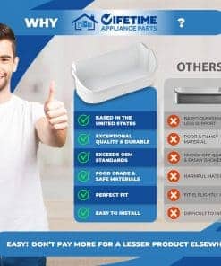 ESPECIFICACIONES Compatible con refrigerador Frigidaire. Sustituye los números de parte: 240356401, AP2116036, 240356405, 240356406, 240356409, 891213, AH430121, EA430121, PS430121, B00545B2R6. Si no está seguro de que nuestra pieza de repuesto se ajuste a su modelo de electrodoméstico, ¡estamos encantados de ayudarle! Por favor, avísenos (1) su número de modelo y (2) el artículo en cuestión a través del siguiente enlace: ss/ayuda/contacto/ codificación UTF8&marketplaceID ATVPDKIKX0DER&ref v sp contact seller&sellerID A1DJ19X7QQXXQ9. Los nombres comerciales y logotipos de Whirlpool, Samsung, General Electric, Frigidaire, Kenmore, Sears son marcas comerciales registradas de sus respectivos propietarios. Cualquier uso de los nombres comerciales anteriores para este producto se realiza únicamente con el propósito de demostrar compatibilidad.