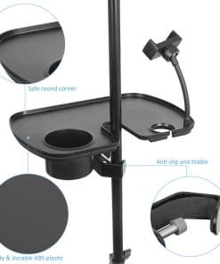Bandeja de plástico Auhafaly para soporte de micrófono en escenarios de conciertos y actuaciones vocales. Esta bandeja de gran tamaño (10.3 x 8.07 pulgadas) está diseñada para organizar fácilmente accesorios pequeños como teléfonos, tazas, llaves, etc. Cuenta con una abrazadera especial para sostener su teléfono móvil con seguridad. Las abrazaderas ajustables permiten que esta bandeja se pueda sujetar a la mayoría de los soportes de micrófono de hasta 1.38 pulgadas de diámetro. La instalación es súper fácil y no requiere herramientas, todo se puede hacer en cuestión de segundos. Fabricada con material resistente y duradero con accesorios de metal, esta bandeja garantiza la seguridad de sus accesorios durante el transporte. Si está buscando un accesorio práctico y útil para su actuación, esta bandeja de soporte de micrófono es la elección perfecta. Además, puede ser un regalo maravilloso para cualquier amante de la música.