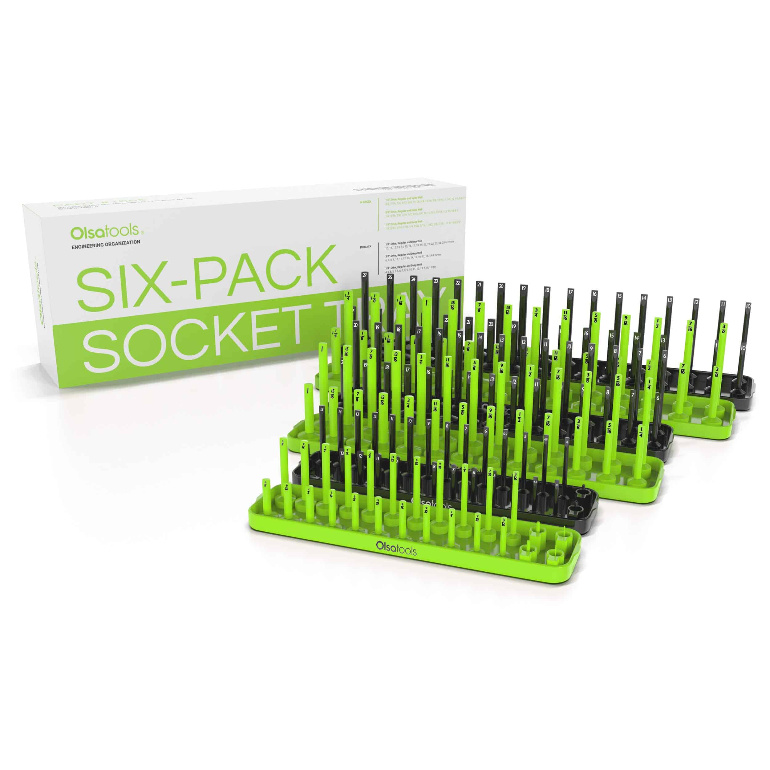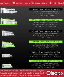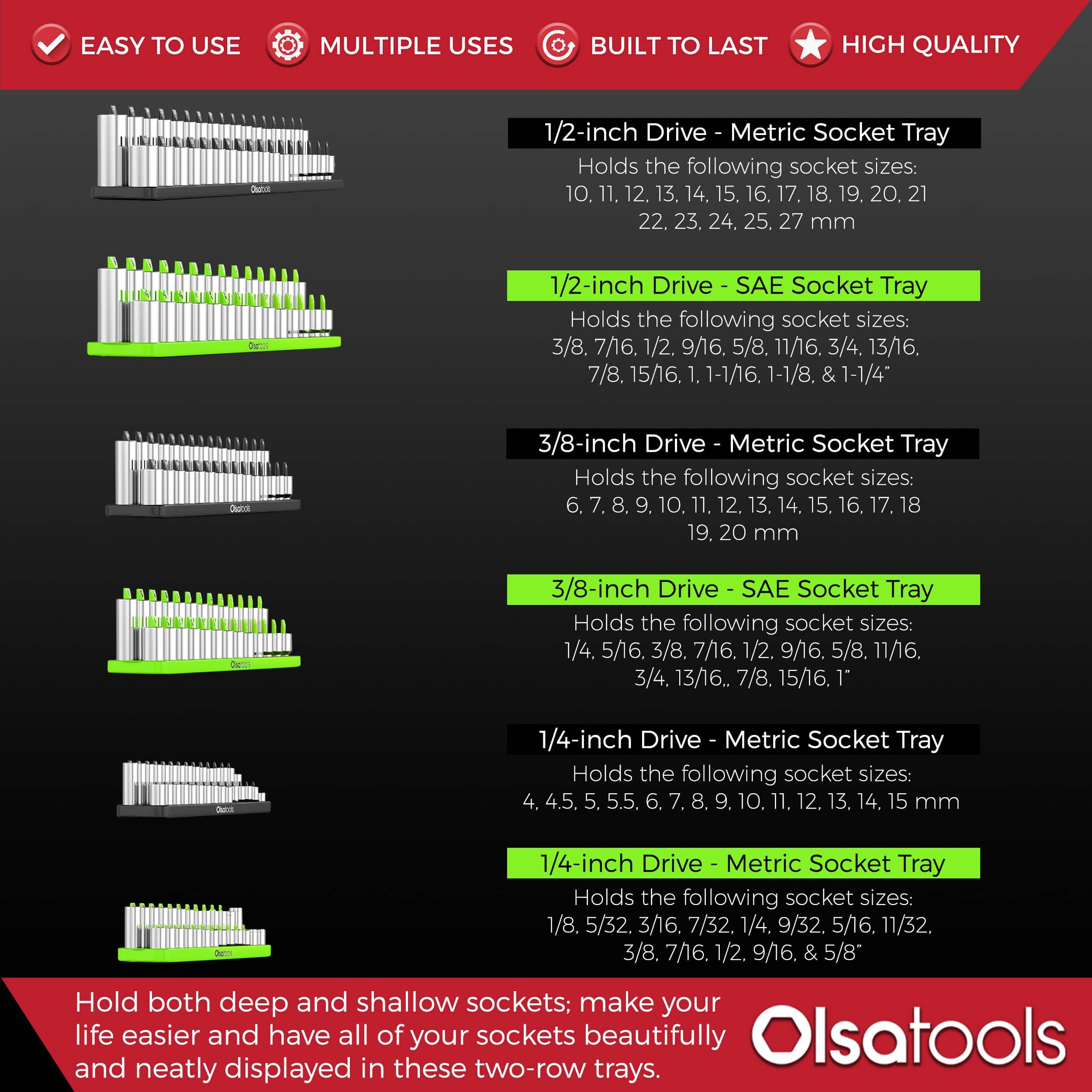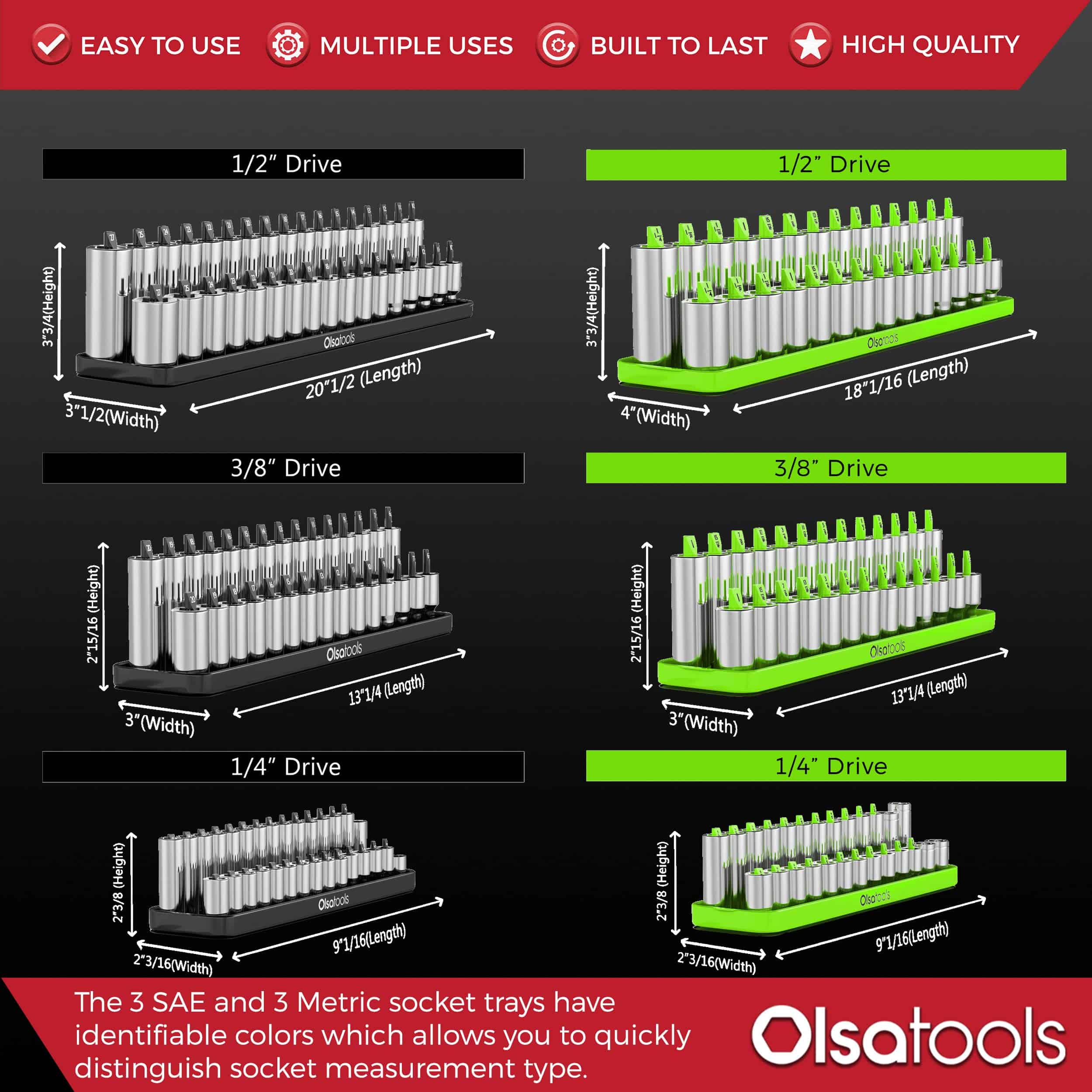 b SAE (Verde) y Métricas (Negro) Bandejas de Almacenamiento de Enchufes – Juego de 6 Piezas /b p p b ¿Qué tamaño de enchufe tiene cada bandeja de herramientas? /b p p b En Verde (SAE): /b p p 1. Drive de 1/2 pulgada, Regular y Profunda (3/8, 7/16, 1/2, 9/16, 5/8, 11/16, 3/4, 13/16, 7/8, 15/16, 1, 1-1/16, 1-1/8 y 1-1/4 pulgadas) p 2. Drive de 3/8 pulgadas, Regular y Profunda (1/4, 5/16, 3/8, 7/16, 1/2, 9/16, 5/8, 11/16, 3/4, 13/16, 7/8, 15/16 y 1 pulgada) p 3. Drive de 1/4 pulgadas, Regular y Profunda (1/8, 5/32, 3/16, 7/32, 1/4, 9/32, 5/16, 11/32, 3/8, 7/16, 1/2, 9/16 y 5/8 pulgadas) p p b En Negro (Métricas): /b p p 1. Drive de 1/2 pulgada, Regular y Profunda (10, 11, 12, 13, 14, 15, 16, 17, 18, 19, 20, 21, 22, 23, 24, 25 y 27mm) p 2. Drive de 3/8 pulgadas, Regular y Profunda (6, 7, 8, 9, 10, 11, 12, 13, 14, 15, 16, 17, 18, 19 y 20mm) p 3. Drive de 1/4 pulgadas, Regular y Profunda (4, 4.5, 5, 5.5, 6, 7, 8, 9, 10, 11, 12, 13, 14 y 15mm) p p p b ¿Cuáles son las dimensiones de cada bandeja de herramientas? /b p p b En Verde (SAE): /b p p 1. Drive de 1/2 pulgada: 18″1/16 x 3″3/4 x 4″ (Longitud x Altura x Ancho) p 2. Drive de 3/8 pulgadas: 13″1/4 x 2″15/16 x 3″ (Longitud x Altura x Ancho) p 3. Drive de 1/4 pulgadas: 9″1/16 x 2″3/8 x 2″3/16 (Longitud x Altura x Ancho) p p p b En Negro (Métricas): /b p p 1. Drive de 1/2 pulgada: 20″1/2 x 3″3/4 x 3″1/2 (Longitud x Altura x Ancho) p 2. Drive de 3/8 pulgadas: 13″1/4 x 2″15/16 x 3″ (Longitud x Altura x Ancho) p 3. Drive de 1/4 pulgadas: 9″1/16 x 2″3/8 x 2″3/16 (Longitud x Altura x Ancho) p b Este kit incluye: /b p – 3 bandejas de almacenamiento de enchufes SAE verdes para Drive de 1/4 pulgadas, 3/8 pulgadas y 1/2 pulgadas p – 3 bandejas de almacenamiento de enchufes métricos negros para Drive de 1/4 pulgadas, 3/8 pulgadas y 1/2 pulgadas p b ¡LOS ENCHUFES NO ESTÁN INCLUIDOS! /b p p p b ¡Obtenga su kit de bandejas de herramientas de Olsa Tools AHORA, estará feliz de haberlo hecho! /b