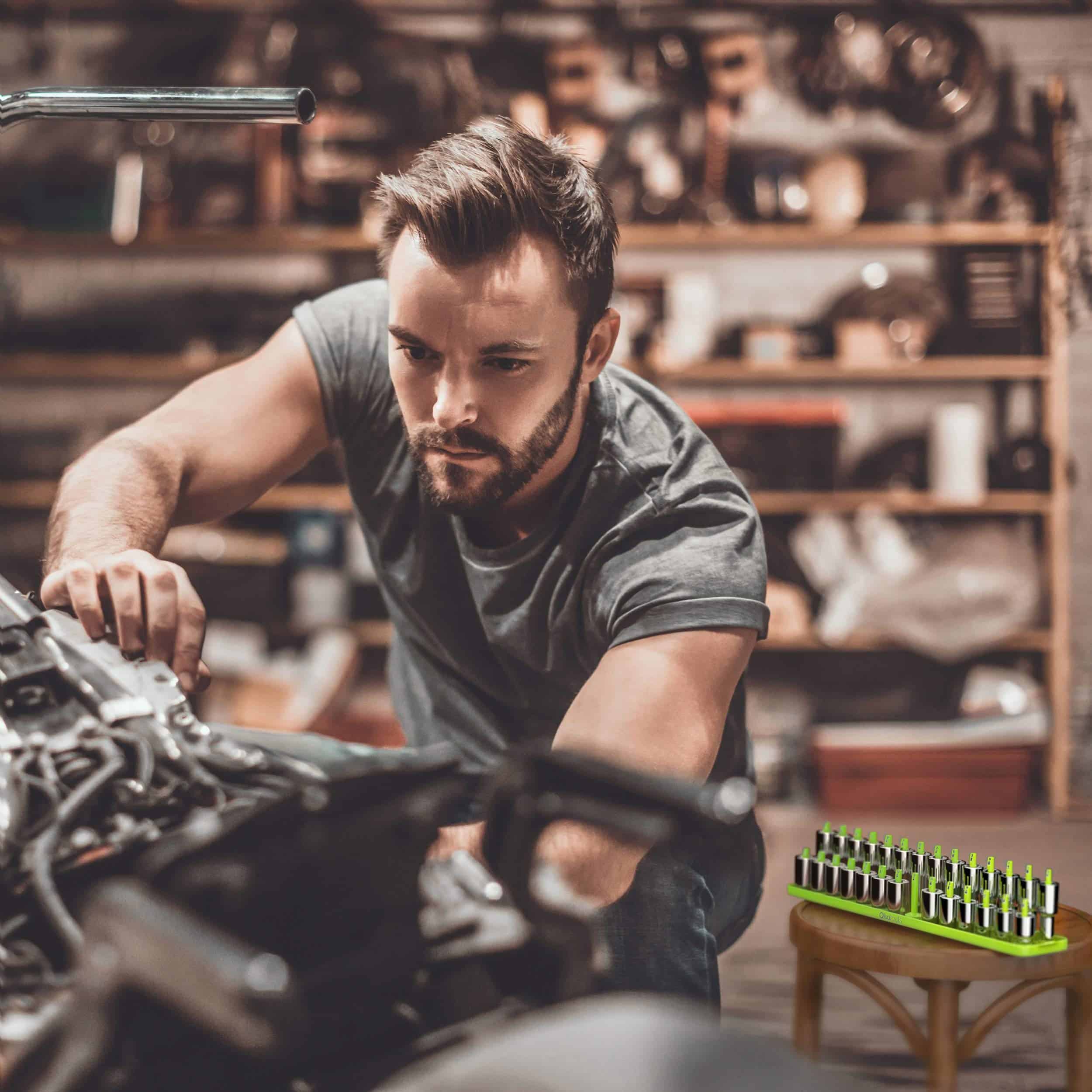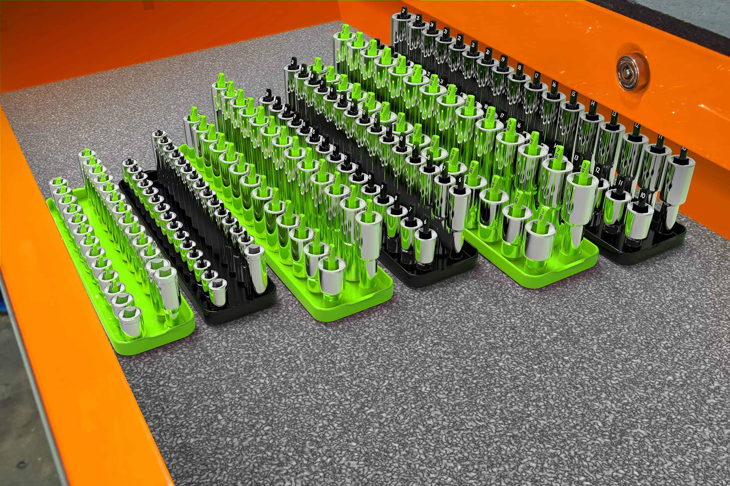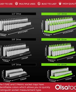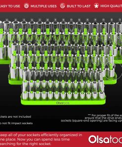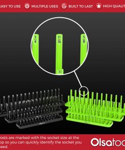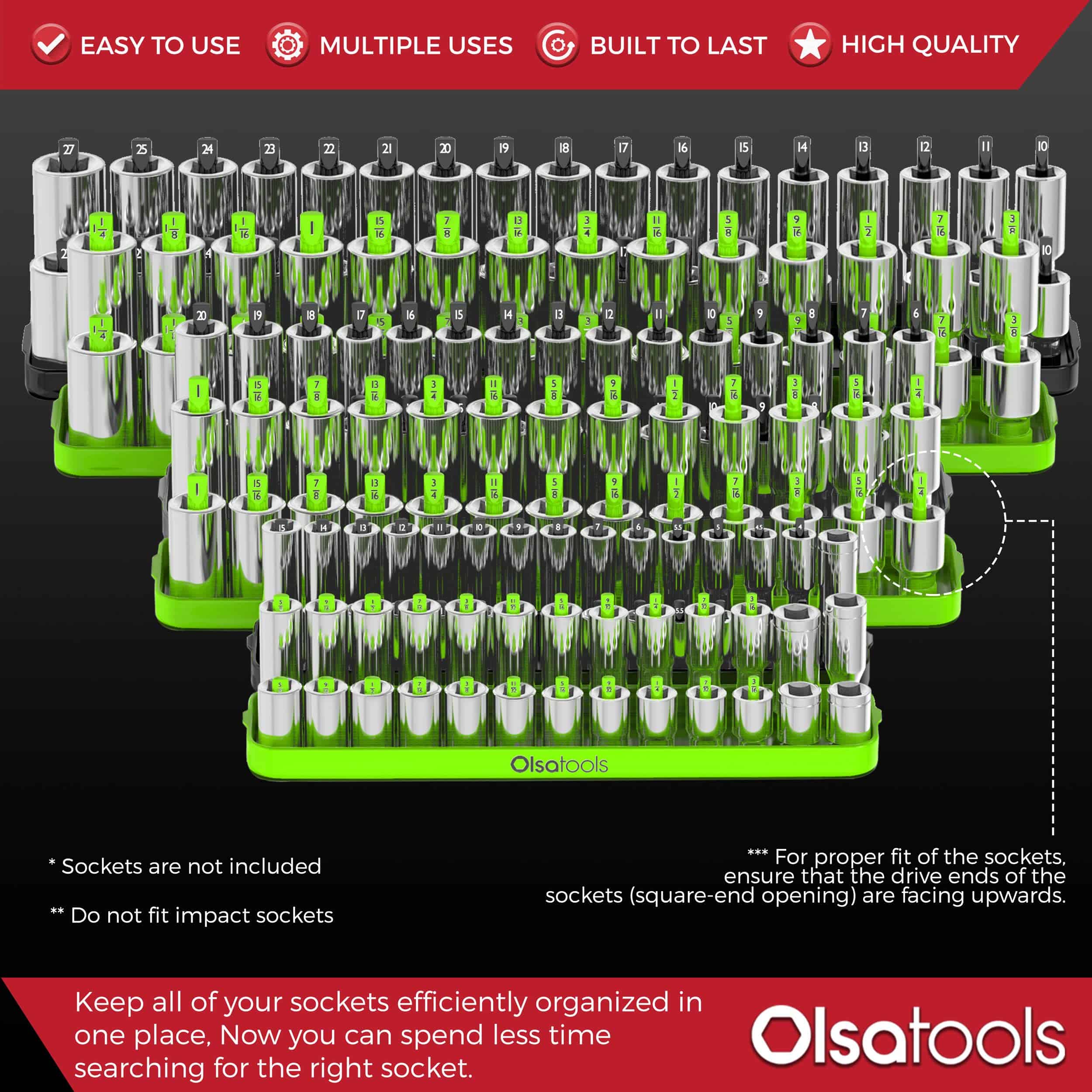 b SAE (Verde) y Métricas (Negro) Bandejas de Almacenamiento de Enchufes – Juego de 6 Piezas /b p p b ¿Qué tamaño de enchufe tiene cada bandeja de herramientas? /b p p b En Verde (SAE): /b p p 1. Drive de 1/2 pulgada, Regular y Profunda (3/8, 7/16, 1/2, 9/16, 5/8, 11/16, 3/4, 13/16, 7/8, 15/16, 1, 1-1/16, 1-1/8 y 1-1/4 pulgadas) p 2. Drive de 3/8 pulgadas, Regular y Profunda (1/4, 5/16, 3/8, 7/16, 1/2, 9/16, 5/8, 11/16, 3/4, 13/16, 7/8, 15/16 y 1 pulgada) p 3. Drive de 1/4 pulgadas, Regular y Profunda (1/8, 5/32, 3/16, 7/32, 1/4, 9/32, 5/16, 11/32, 3/8, 7/16, 1/2, 9/16 y 5/8 pulgadas) p p b En Negro (Métricas): /b p p 1. Drive de 1/2 pulgada, Regular y Profunda (10, 11, 12, 13, 14, 15, 16, 17, 18, 19, 20, 21, 22, 23, 24, 25 y 27mm) p 2. Drive de 3/8 pulgadas, Regular y Profunda (6, 7, 8, 9, 10, 11, 12, 13, 14, 15, 16, 17, 18, 19 y 20mm) p 3. Drive de 1/4 pulgadas, Regular y Profunda (4, 4.5, 5, 5.5, 6, 7, 8, 9, 10, 11, 12, 13, 14 y 15mm) p p p b ¿Cuáles son las dimensiones de cada bandeja de herramientas? /b p p b En Verde (SAE): /b p p 1. Drive de 1/2 pulgada: 18″1/16 x 3″3/4 x 4″ (Longitud x Altura x Ancho) p 2. Drive de 3/8 pulgadas: 13″1/4 x 2″15/16 x 3″ (Longitud x Altura x Ancho) p 3. Drive de 1/4 pulgadas: 9″1/16 x 2″3/8 x 2″3/16 (Longitud x Altura x Ancho) p p p b En Negro (Métricas): /b p p 1. Drive de 1/2 pulgada: 20″1/2 x 3″3/4 x 3″1/2 (Longitud x Altura x Ancho) p 2. Drive de 3/8 pulgadas: 13″1/4 x 2″15/16 x 3″ (Longitud x Altura x Ancho) p 3. Drive de 1/4 pulgadas: 9″1/16 x 2″3/8 x 2″3/16 (Longitud x Altura x Ancho) p b Este kit incluye: /b p – 3 bandejas de almacenamiento de enchufes SAE verdes para Drive de 1/4 pulgadas, 3/8 pulgadas y 1/2 pulgadas p – 3 bandejas de almacenamiento de enchufes métricos negros para Drive de 1/4 pulgadas, 3/8 pulgadas y 1/2 pulgadas p b ¡LOS ENCHUFES NO ESTÁN INCLUIDOS! /b p p p b ¡Obtenga su kit de bandejas de herramientas de Olsa Tools AHORA, estará feliz de haberlo hecho! /b