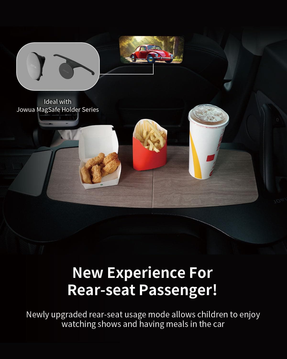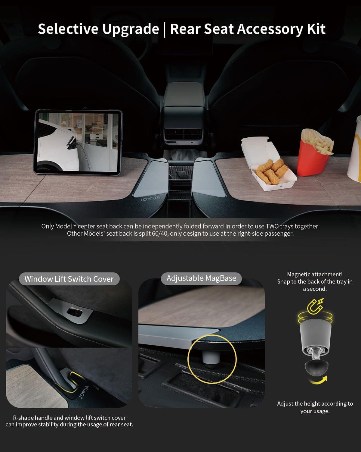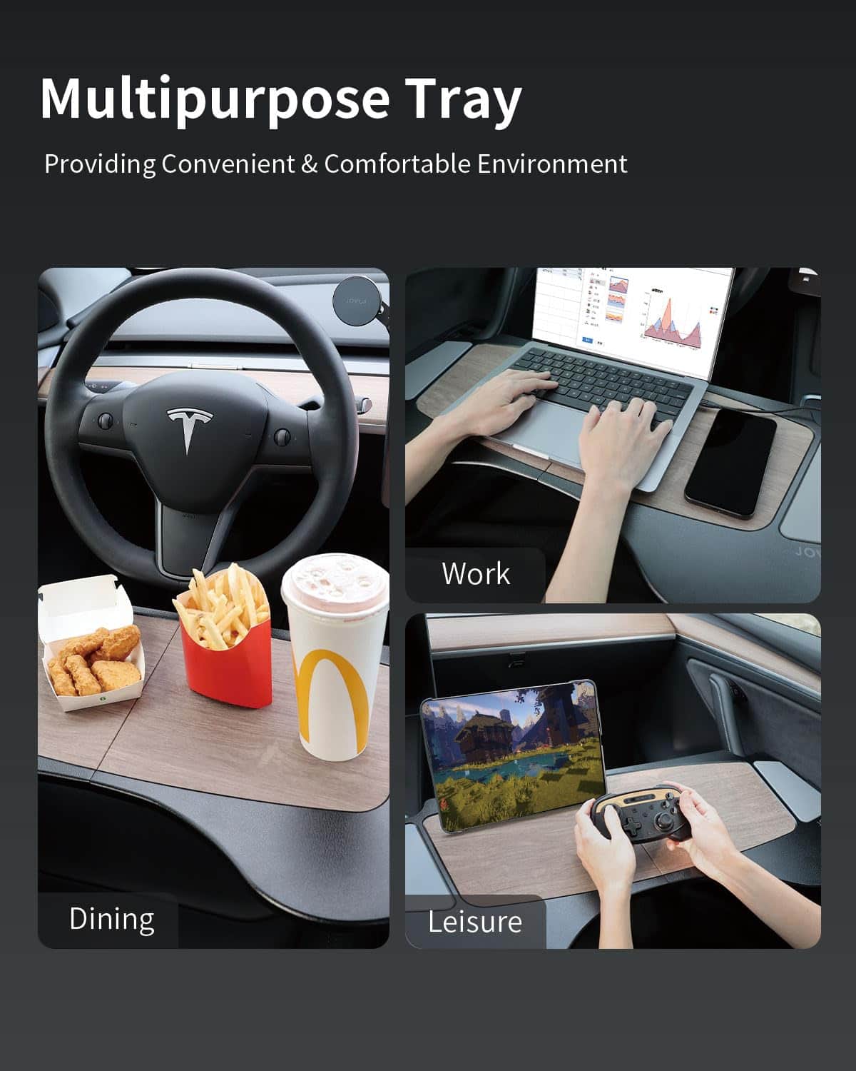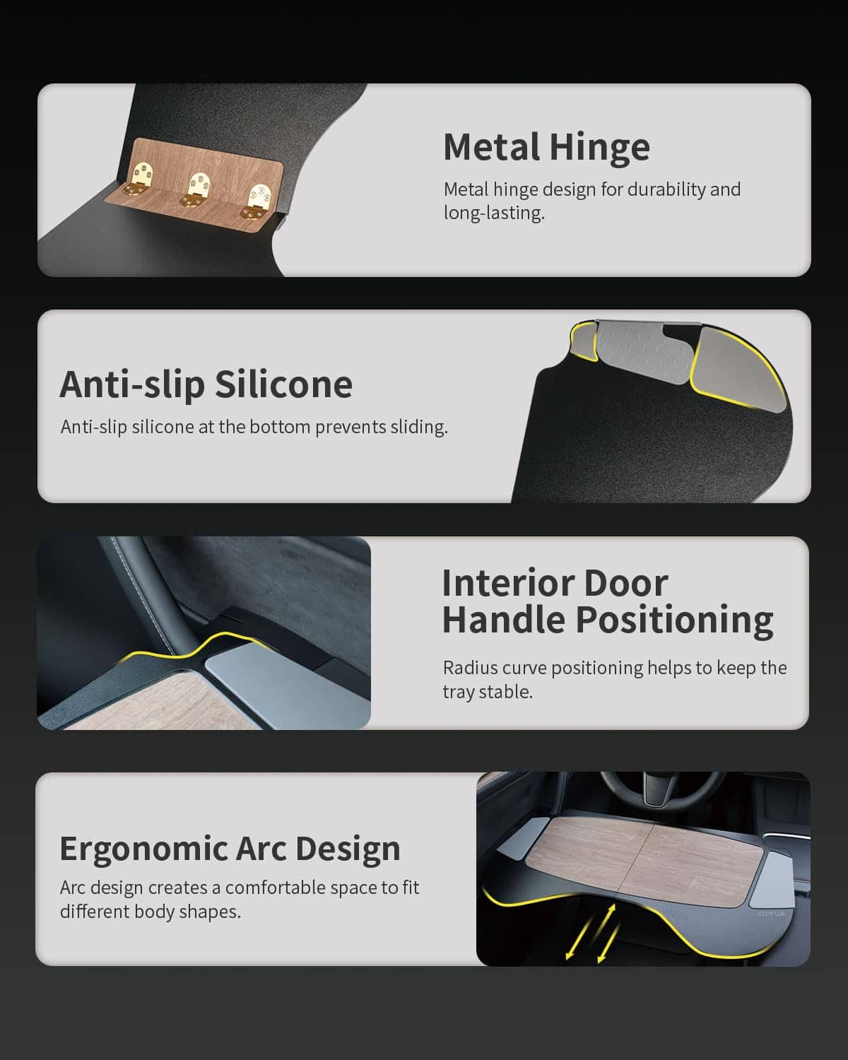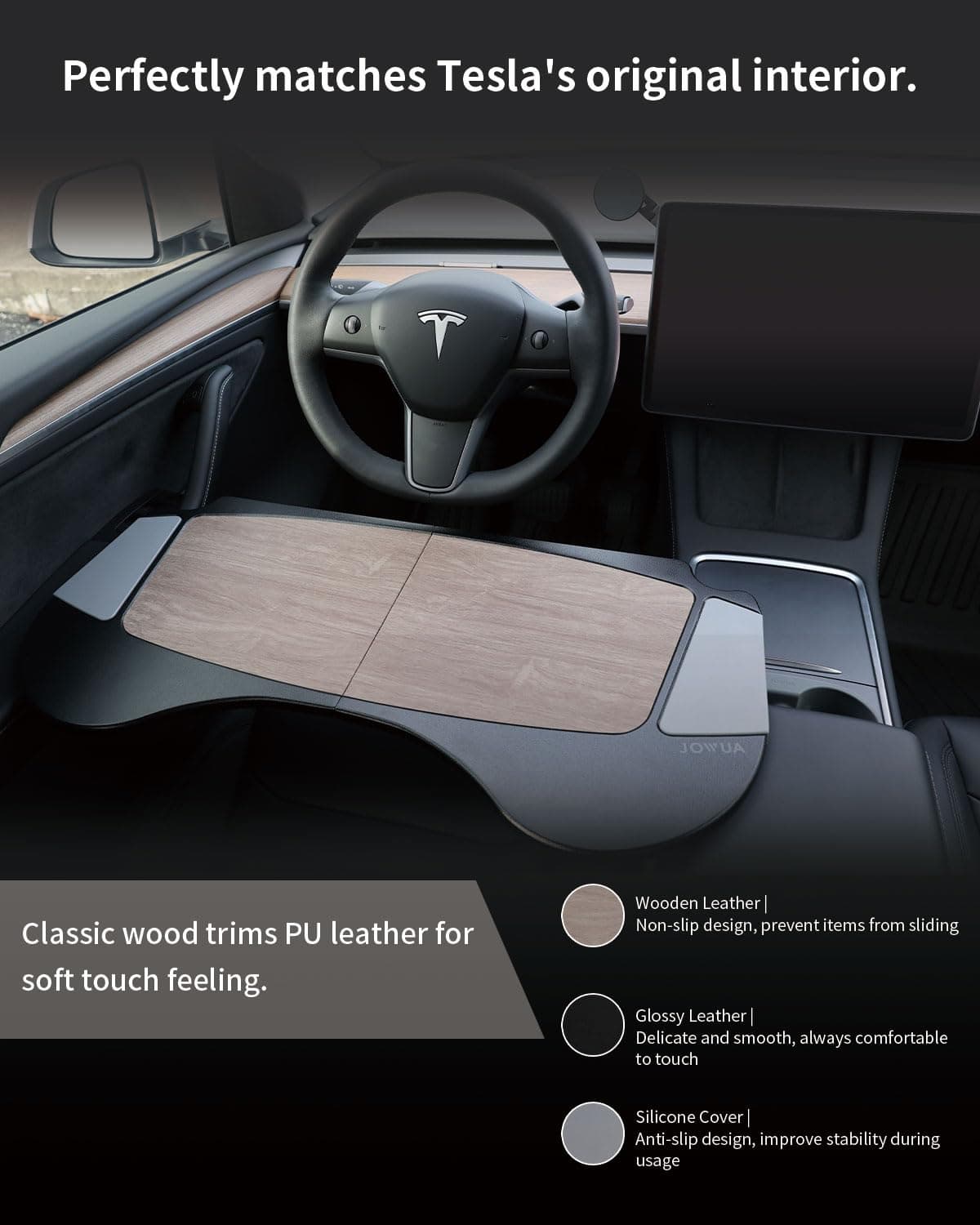 Tamaño: 69.3 x 33.8 x 1.2 cm. Material: tablero de fibra cuero PU. La Bandejilla Plegable para Automóvil Jowua está diseñada específicamente para adaptarse a los asientos delanteros de los modelos Tesla Model S/3/X/Y, proporcionando un espacio cómodo y conveniente para trabajar o disfrutar de comidas. Con un diseño plegable con bisagra, es fácil de abrir y cerrar para un almacenamiento rápido en el maletero delantero del Model 3/Y. El elegante diseño de patrón de madera combina perfectamente con el interior del vehículo, mientras que los materiales premium como el cuero PU y el tablero de fibra ofrecen una sensación suave al tacto y durabilidad para un uso prolongado.