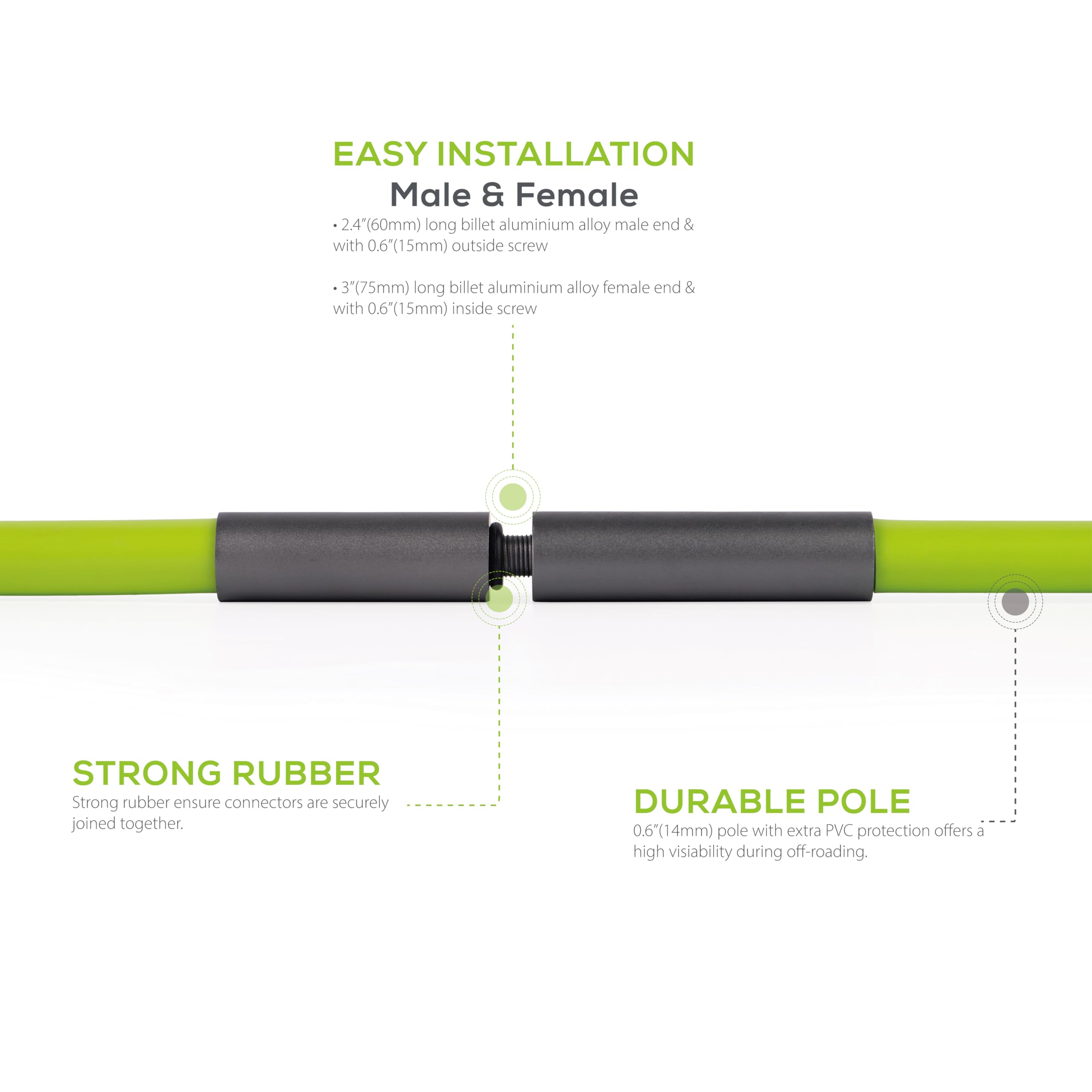 2. Resistencia en Ambientes Hostiles: fabricada con fibra de vidrio especial de 14 mm de diámetro con protección adicional de PVC. Los insertos de aluminio de alta calidad unen cada sección y un diseño único de sistema de montaje de conector rápido permite una instalación muy fácil en el vehículo.