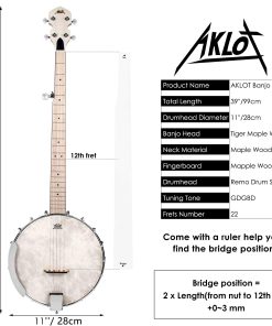 Banjo de 5 cuerdas AKLOT hecho de madera de arce, con un sonido brillante y claro. Cabeza Remo de alta calidad para un sonido profesional. 18 brackets para una mayor estabilidad y fácil ajuste. Puente de madera sólida para una mejor vibración de las cuerdas. Incluye un kit completo con banjo de tamaño completo, cuerdas, afinador, 2 llaves de afinación, púa, correa, paño de limpieza y estuche. Todo lo necesario para principiantes y profesionales. Garantía de 12 meses.