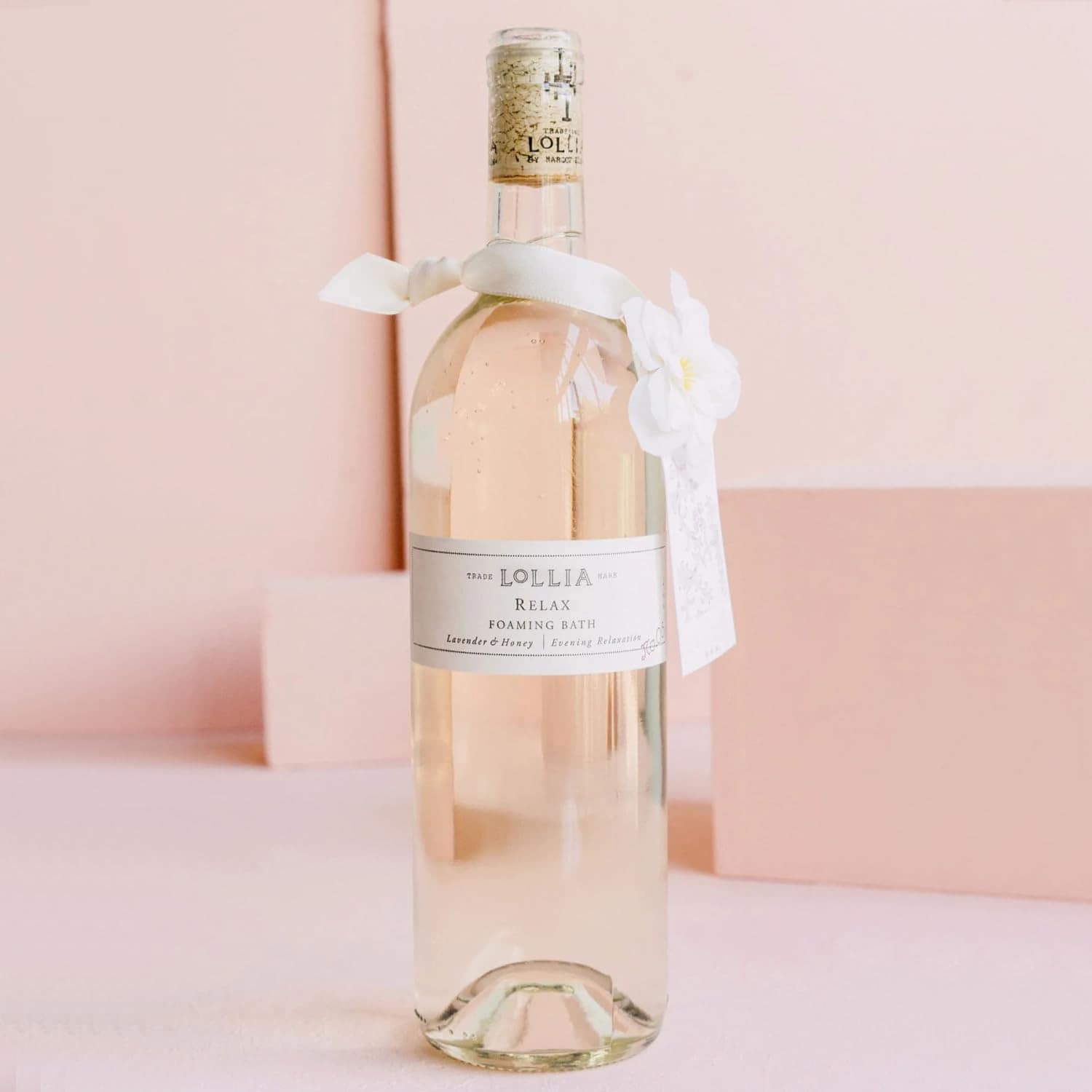 3. UNA BOTELLA DE CRISTAL LLAMATIVA: Esta botella clásica con forma de vino está elegantemente terminada con un corsé de flores blancas, una cinta de raso y un corcho con la firma de Lollia. Presentado en los Artículos Favoritos de Oprah.
