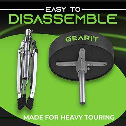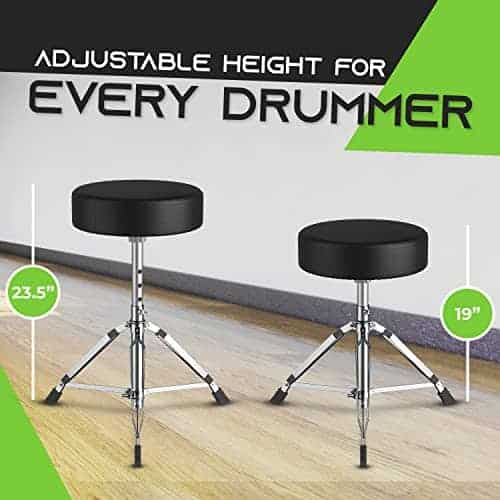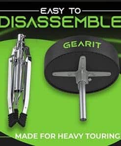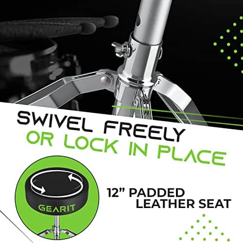 Banqueta de batería GearIT con asiento de cuero acolchado, patas dobles reforzadas, control giratorio, pies de goma antideslizantes, altura de hasta 23.5 pulgadas. La amplia base de trípode de acero doblemente reforzado mantiene la banqueta de batería enraizada en el escenario durante actuaciones en vivo intensas cuando se necesita estabilidad. El asiento de cuero acolchado está diseñado para brindar comodidad a largo plazo con una capa gruesa de espuma en su interior, lo suficientemente suave para mantenerlo cómodo durante largas sesiones de batería, pero lo suficientemente resistente para resistir la rigurosidad de los conciertos y la práctica diaria. Además, los pies de goma antideslizantes garantizan que la banqueta no se deslice en superficies comunes. Ajuste la altura de 19 a 23.5 pulgadas y bloquéela firmemente sin deslizarse. Establezca el asiento de la batería para girar o no, según su preferencia. Todos los puntos de ajuste se mantienen en su lugar hasta que llegue el momento de plegar su banqueta.