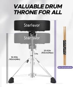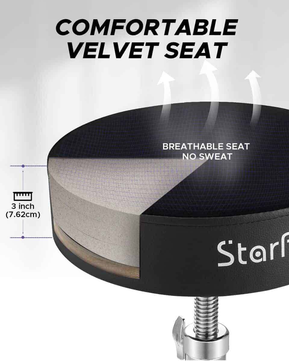 1. ASIENTO ACOLCHADO CÓMODO: El asiento de batería de 3.15 pulgadas de grosor con esponja de alta densidad proporciona un soporte suave pero firme para los bateristas durante sesiones prolongadas. Es duradero y resistente, asegurando comodidad y rendimiento duraderos.