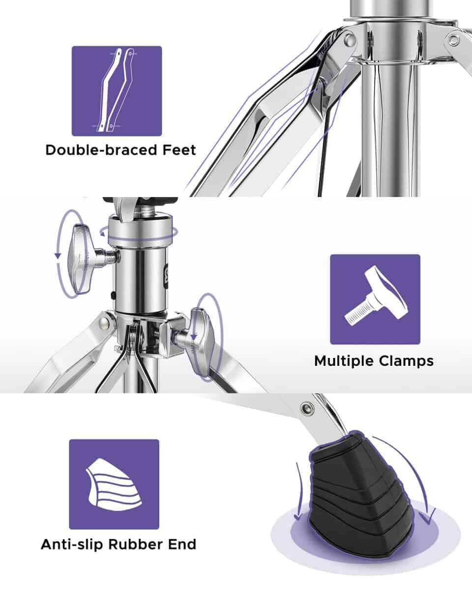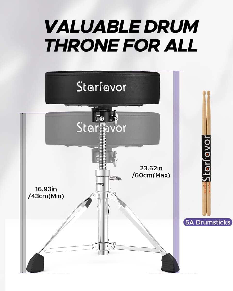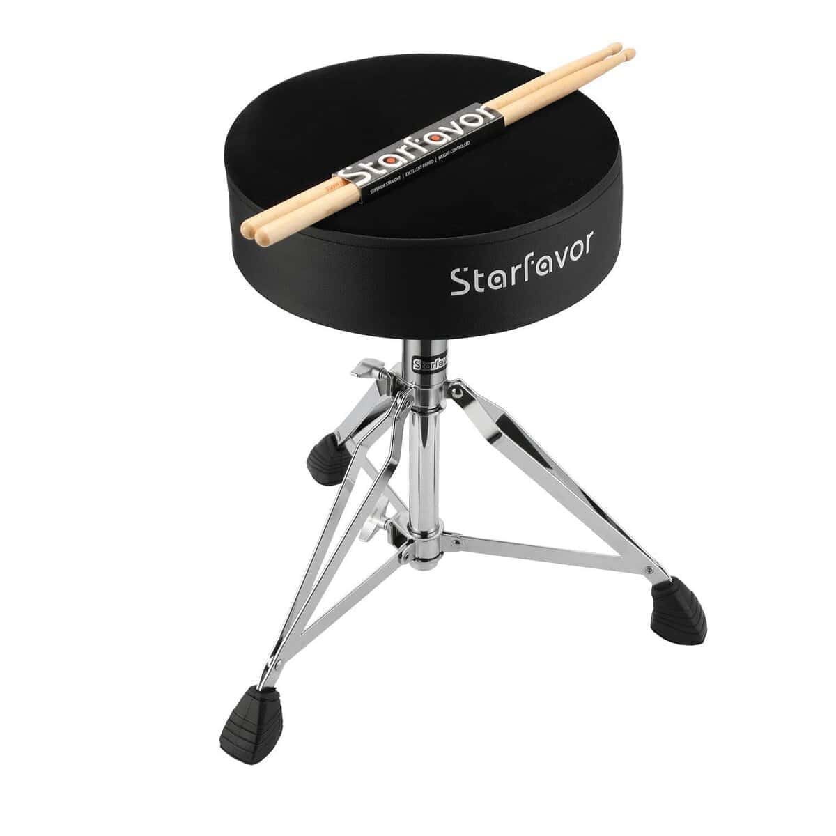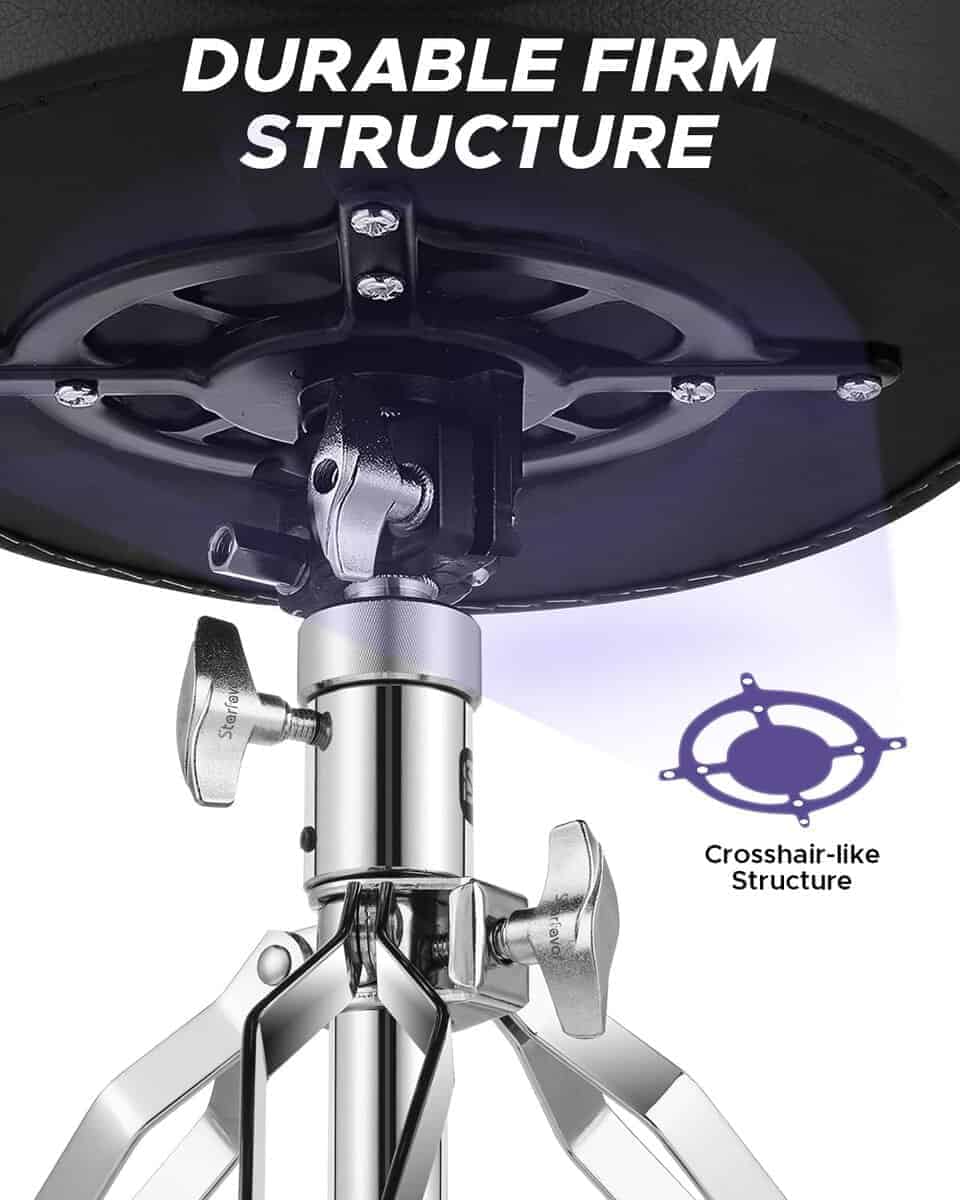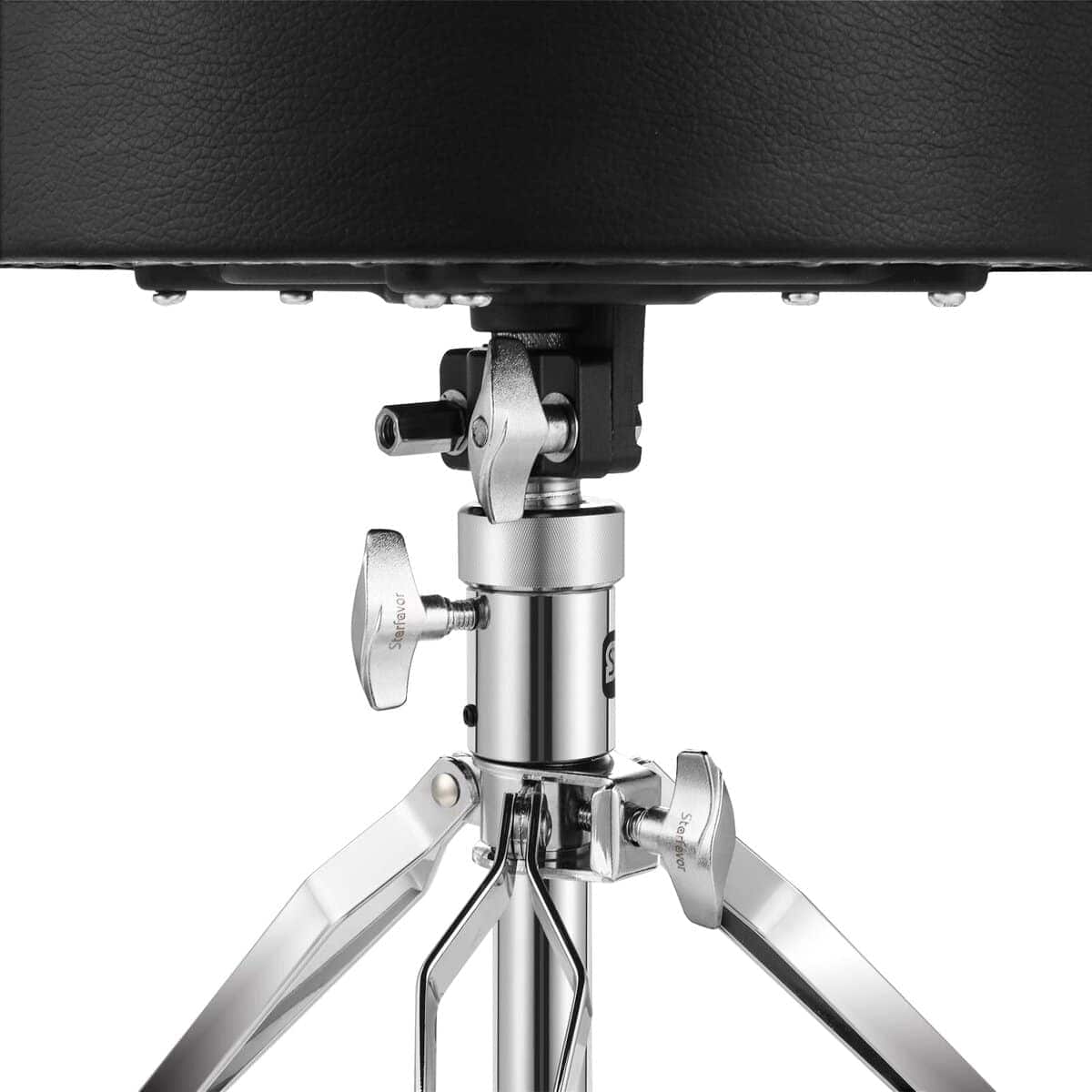 5. TRÍPODE ANTIDESLIZANTE DE DOBLE SOPORTE: La silla de batería Starfavor tiene un trípode resistente, doble soporte y antideslizante para estabilidad. Aterrizando completamente en el suelo, los grandes pies de goma siempre se agarran fuerte