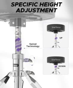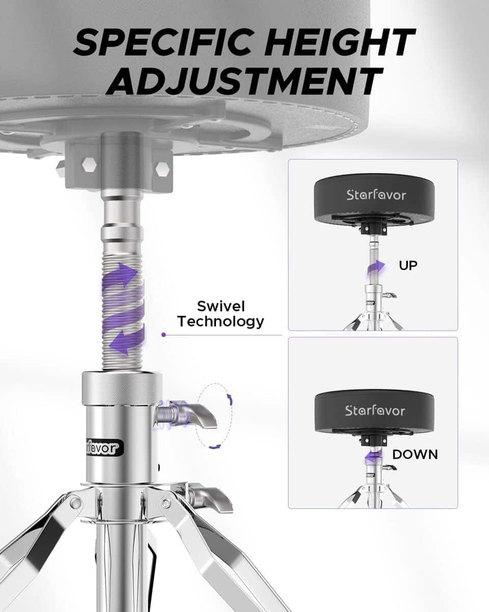4. AJUSTE DE ALTURA GIRATORIO: Ajustable de 16.93 pulgadas a 23.62 pulgadas, este taburete de baterista cuenta con un diseño giratorio para ajustes precisos de altura. La varilla giratoria sólida de 0.9 pulgadas de grosor garantiza durabilidad y calidad profesional.