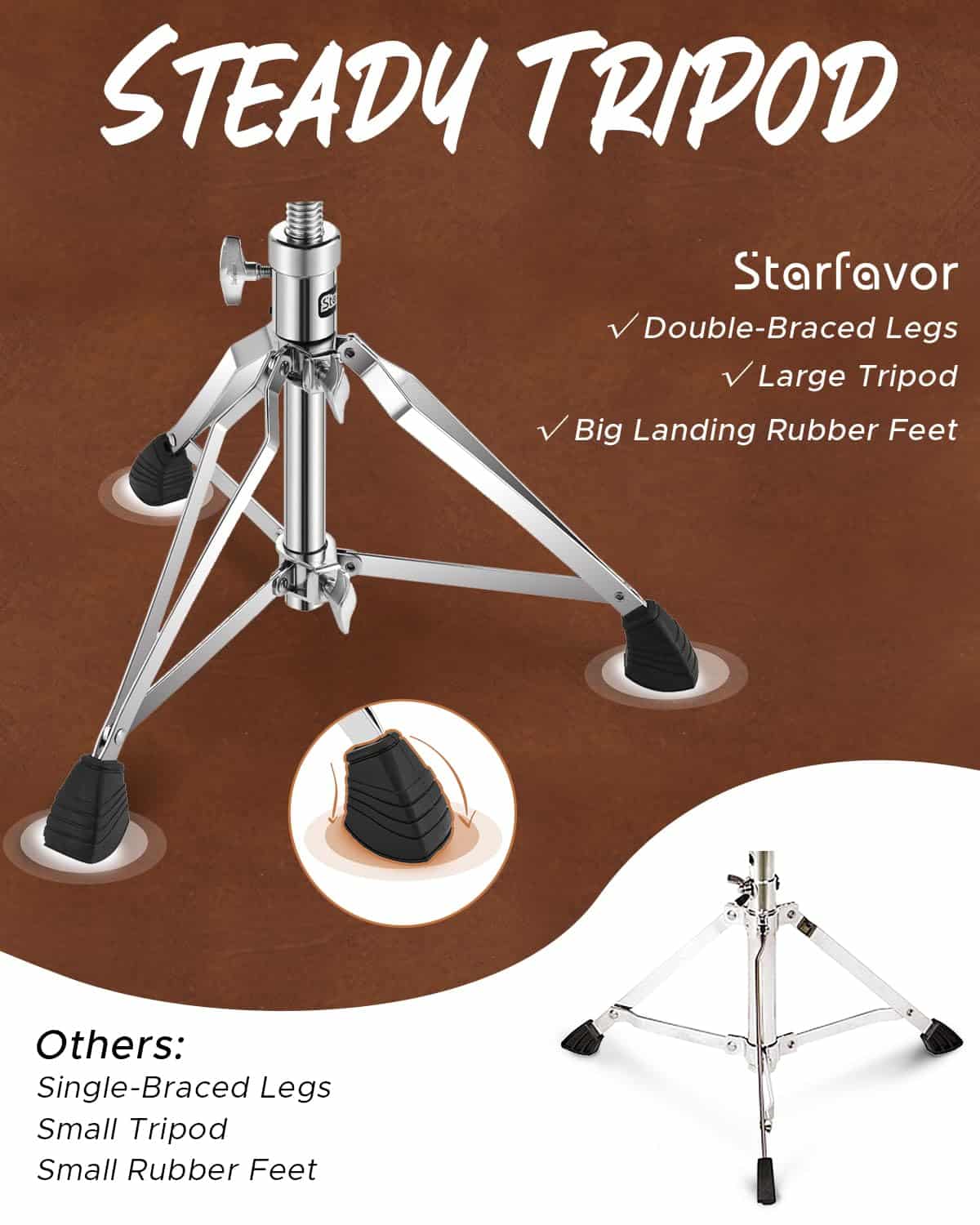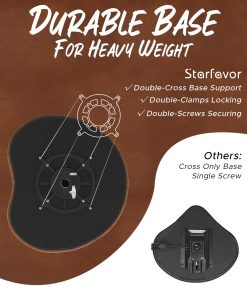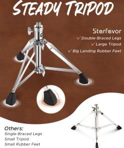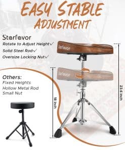 Especificaciones 1. Color: Marrón 2. Nivel: Principiante y jugadores de nivel intermedio 3. Ancho del banco: 0.6 pulgadas | 1.5 cm 4. Material: Cuero, esponja, hierro, aleación de zinc 5. Peso del producto: 7.5 libras 6. Tamaño del paquete: 4.7 (L) x 1.97 (An) x 7.1 (Al) pulgadas 7. Capacidad de peso: 330 libras / 150 kg 8. Rango de altura: 18 pulgadas – 23.6 pulgadas 9. Estilo: Forma de luna. Paquete incluido 1 x Banqueta de batería en forma de luna de la serie Starfavor 550 x 1