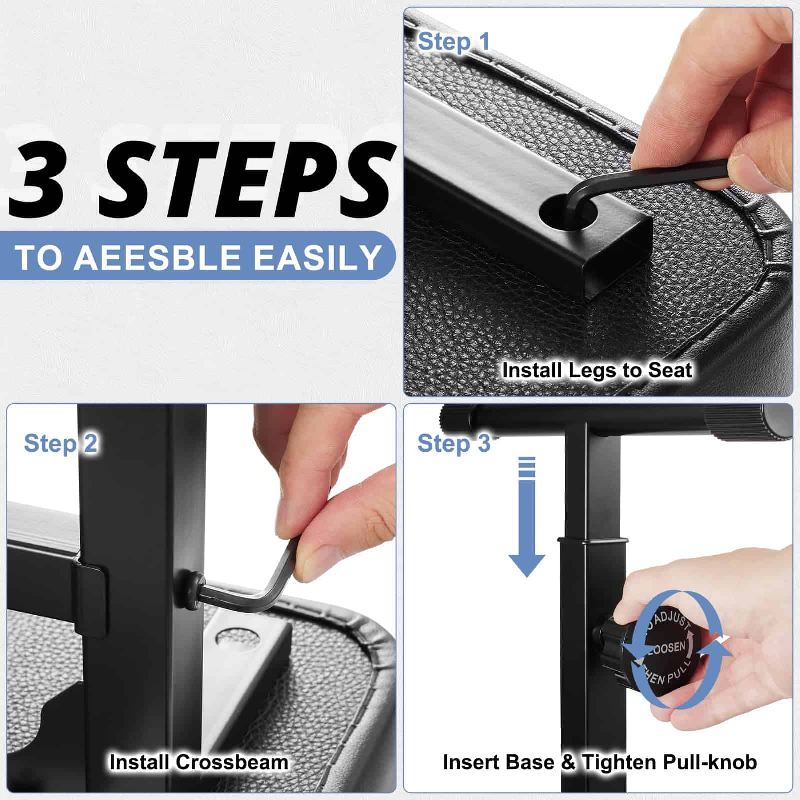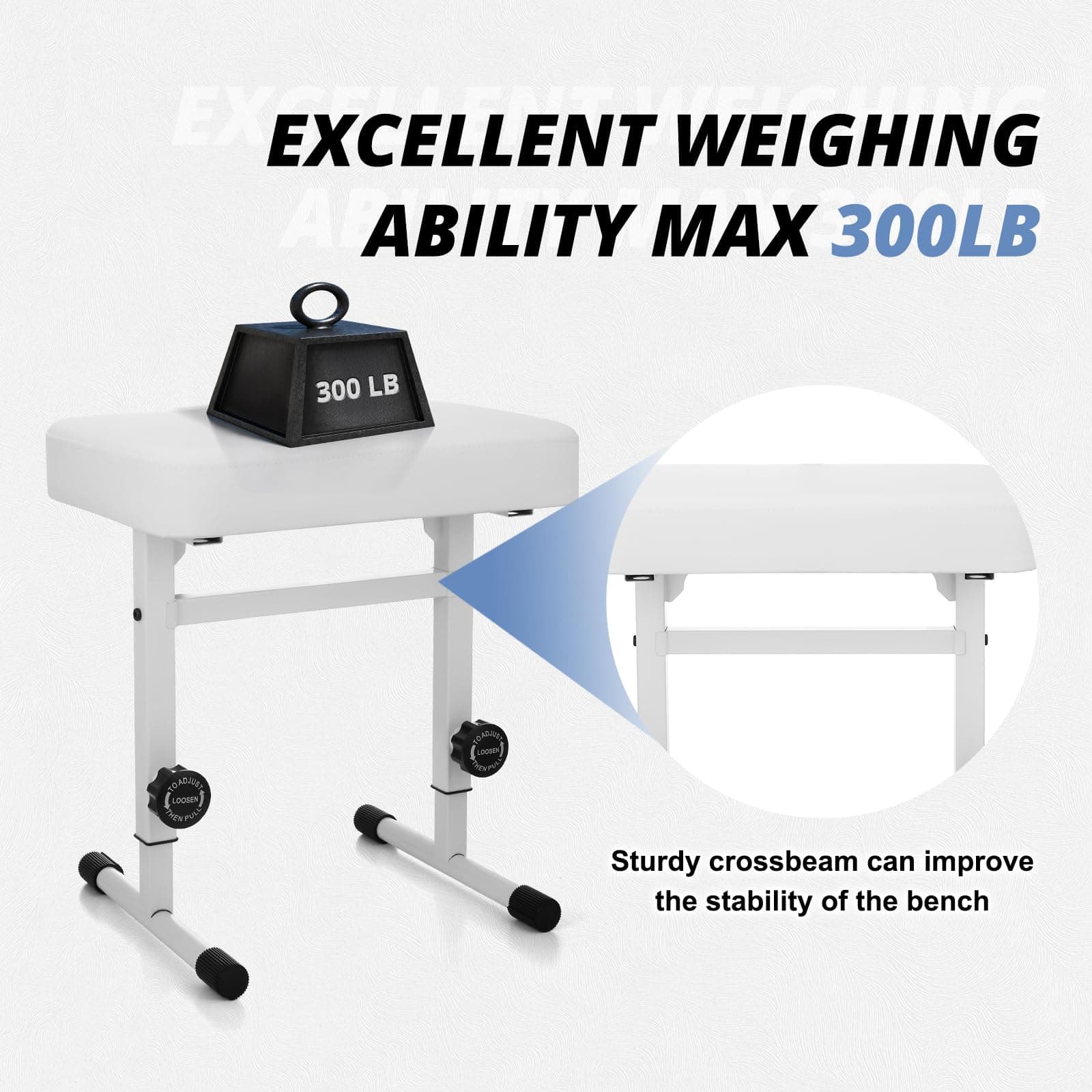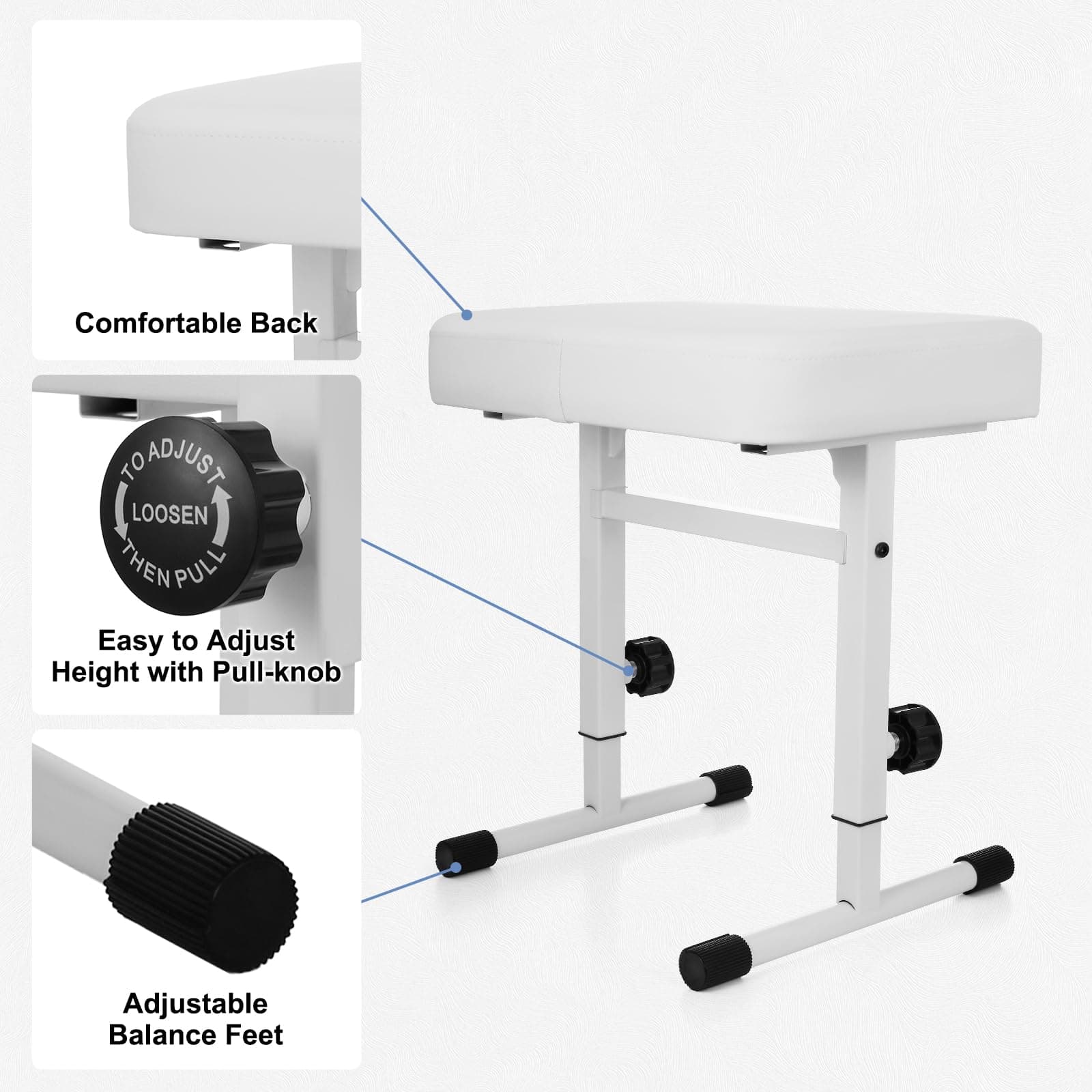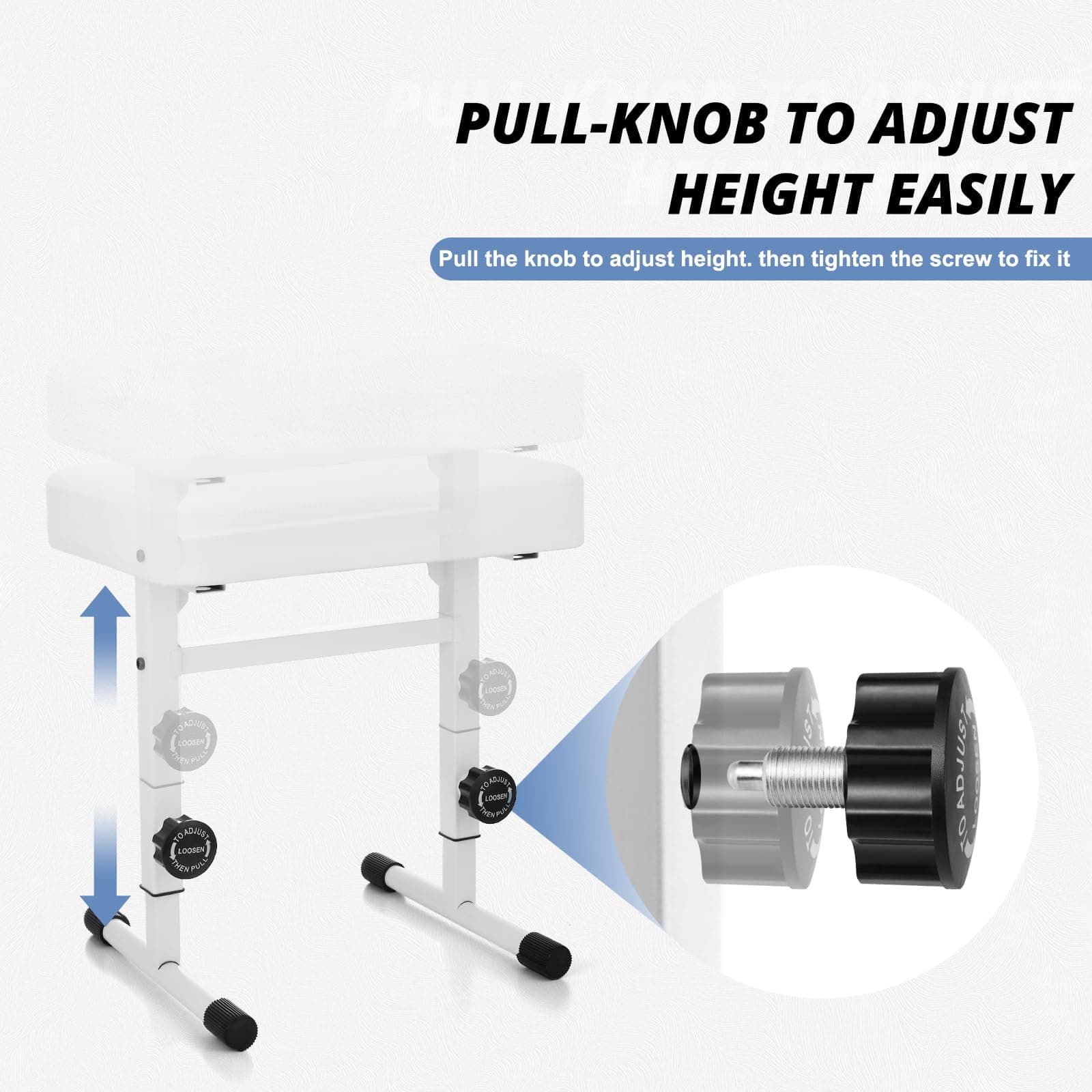 1. Fácil de ajustar: La banqueta de piano de la serie TOTPB500 adopta un diseño de ajuste rápido de altura. Solo necesita tirar de las perillas y fijar la altura, es más conveniente que otros taburetes de piano.