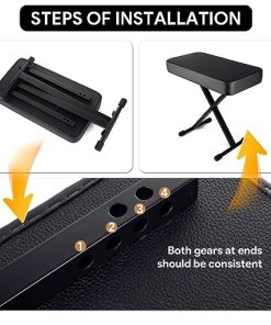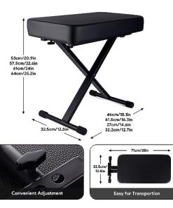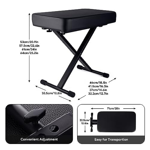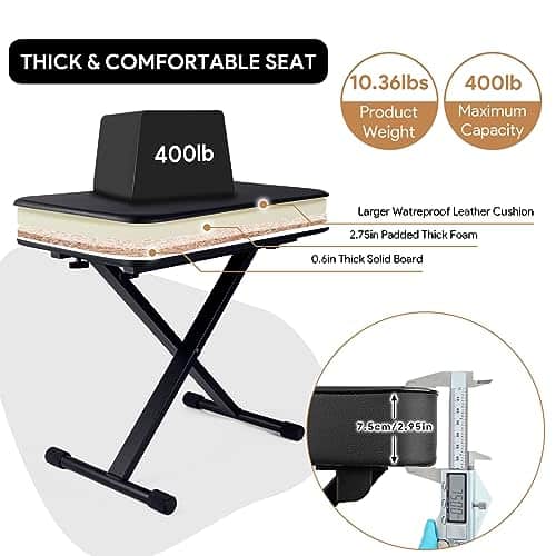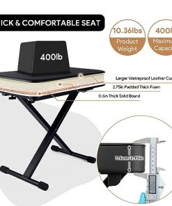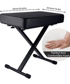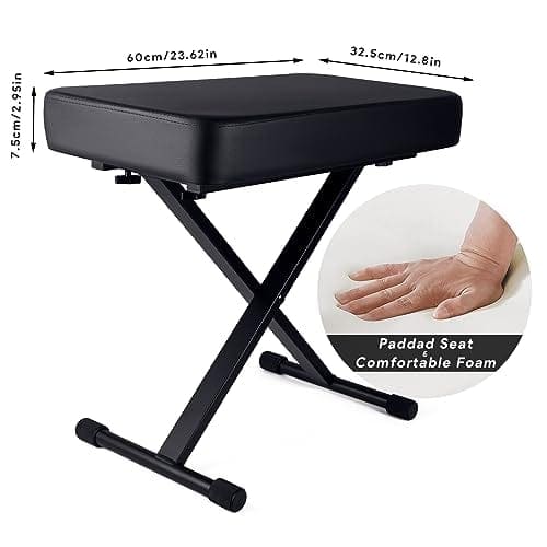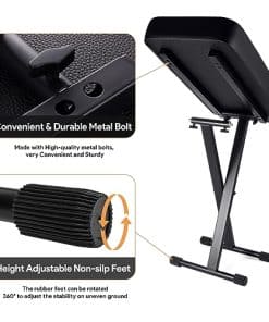 1. Cojín acolchado cómodo: El banco de piano utiliza un cojín de esponja gruesa de 23.62 12.8 2.95 pulgadas, que puede brindarle un soporte estable y reducir la fatiga lumbar durante actuaciones prolongadas. 2. Fácil de instalar y ajustar: los pernos rápidos únicos se ajustan más rápido que un banco de teclado regular. Simplemente inserte ambos pasadores de resorte en diferentes engranajes, solo se necesitan 15 segundos. Altura ajustable de 20.9-25.2 pulgadas. Satisfaga sus diferentes necesidades. 3. Resistente y duradero: El taburete de piano está hecho de conectores de alta calidad y tubos de acero engrosados, que tienen una mejor estabilidad y durabilidad. El diseño portátil hace que el taburete de teclado sea fácil de guardar y transportar. 4. Diseño antideslizante: El banco de piano ajustable tiene 4 grandes cubiertas de goma antideslizantes. No solo protege su suelo, sino que también ajusta la estabilidad del taburete de piano cuando el suelo es irregular. 5. Regalo ideal: El asiento de piano es un regalo ideal para los músicos de piano, teclado y violonchelo. También es una buena opción para regalos de cumpleaños y festivales. 6. Servicio al cliente: Ofrecemos devoluciones y cambios gratuitos, servicio al cliente las 24 horas y garantía de 1 año. Por favor, compre con total tranquilidad.