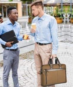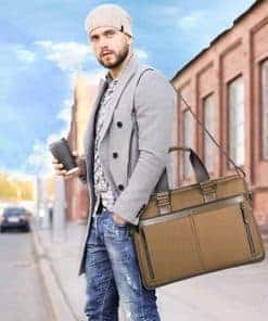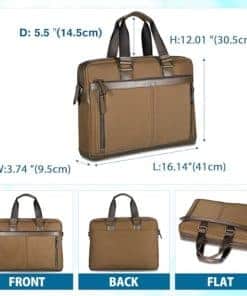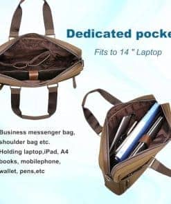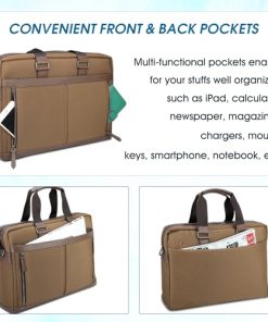 Material: Tela Oxford impermeable con cuero sintético Forro de algodón poliéster marca Hardware duradero en color de pistola Tamaño: 16 x 3.75 x 12 pulgadas (41 x 9.5 x 30.5 cm) Peso neto: 0.9 kg Color: Marrón Característica principal: Asas dobles, altura de caída: 5.1 pulgadas (13 cm) Liviano, impermeable, resistente a las arrugas Funda para laptop para HP 14″ / lenovo 14″ / Macbook pro 14″ Correa para el hombro ajustable y desmontable Exterior: Delantero: 1 bolsillo con cremallera horizontal y 2 bolsillos con cremallera vertical Posterior: 1 compartimento con cierre de botón a presión Interior: 1 bolsillo con cremallera 1 manga para laptop de 14″ 2 bolsillos deslizantes Función: Utilizado como maletín, bolso escolar, bolso mensajero, etc. Sostiene laptop, iPad, archivos A4, teléfono móvil, billetera, bolígrafos, etc. Adecuado para tu vida diaria, viajes y situaciones de negocios Atención: BANUCE es una marca registrada. El único distribuidor exclusivo es BANUCE, nosotros mismos.