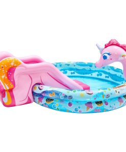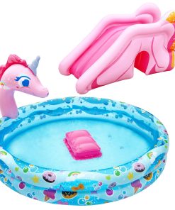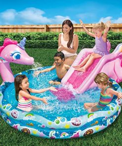 ¡Hay un unicornio en tu patio trasero! ¡Deslízate por el tobogán y sumérgete en la dulzura del verano con la piscina de unicornio Sprinkle ‘N Splash! ¡A los más pequeños les encantará salpicar y jugar con el unicornio mágico y su piscina de 5 pies de diámetro llena de agua!