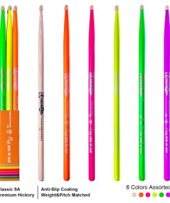 Ponte en marcha con estas baquetas de batería clásicas 5A que ofrecen calidad premium de Hickory. Cada caja contiene 6 palos con una diferencia de peso de solo 2 gramos, lo que te permite crear fácilmente un par de palos a juego. La distribución equilibrada del peso a lo largo de la longitud garantiza un control óptimo y una respuesta precisa, mientras que la superficie laqueada suave y antideslizante te brinda un agarre seguro y cómodo durante largas sesiones de juego. Con un tamaño estándar 5A, estas baquetas son versátiles y adecuadas para una amplia variedad de estilos de batería y niveles de habilidad. Además, el revestimiento UV de color Neon hace que brillen bajo la luz negra, garantizándote una actuación cool en el escenario.