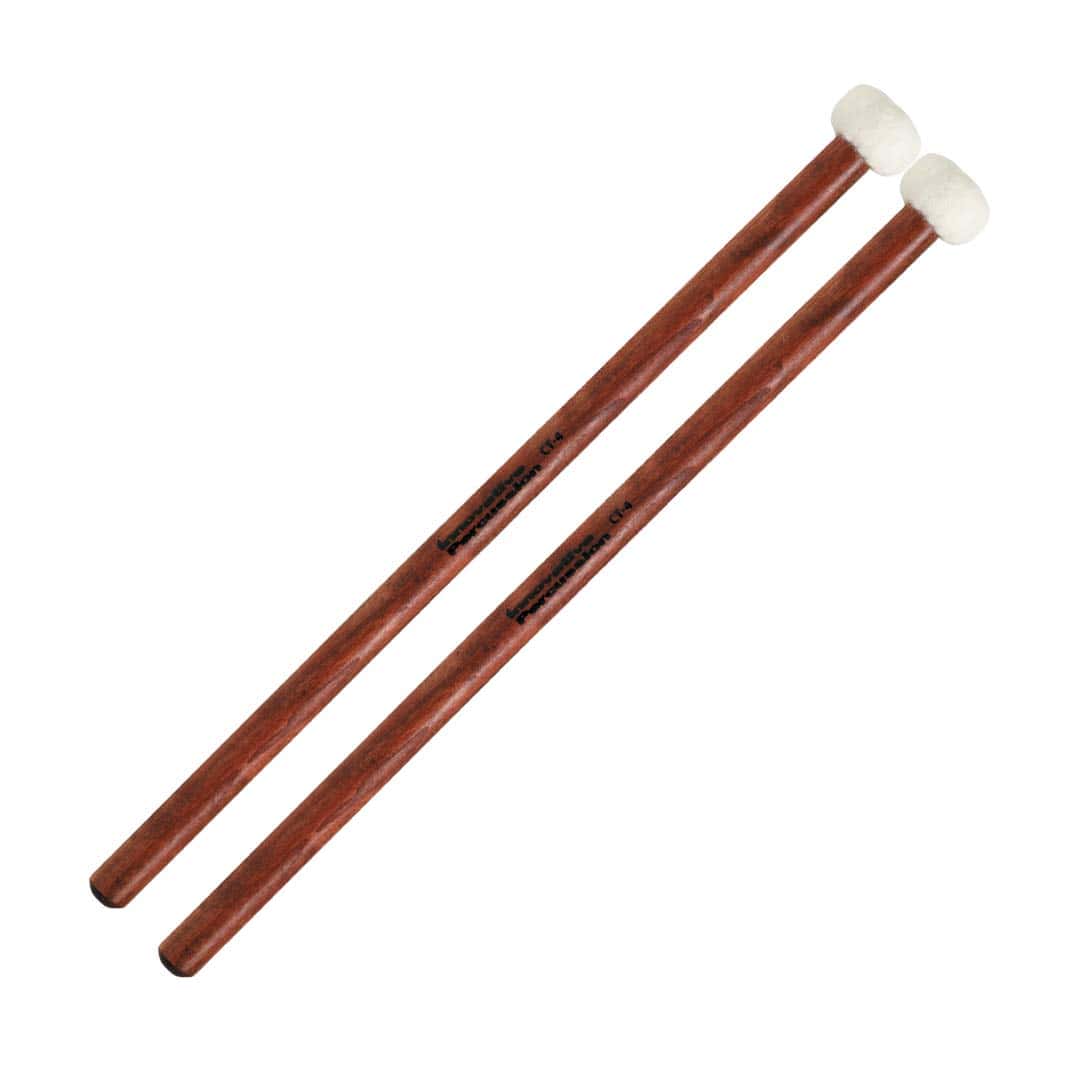 Las baquetas de timbal de la serie de conciertos están construidas con mangos de cerezo de 5/8 de pulgada que están huecos en ambos extremos para simular la sensación y el equilibrio de un mango de bambú. Los cinco modelos de estilo carretilla presentan núcleos de madera, revestimientos de fieltro tejido y las cubiertas de fieltro alemán de mayor calidad, mientras que el modelo CT-6 Ultra staccato tiene un núcleo de fieltro duro para una mayor articulación. Características: Mangos de madera de cerezo de 5/8″, en un rico acabado oscuro, mangos parcialmente ahuecados crean la sensación y el equilibrio de las baquetas de bambú, núcleos de madera en los cinco modelos de carretilla (CT-1, CT-2, CT-3, CT-4, CT-5), bola de fieltro duro en el modelo ultra staccato (CT-6), revestimientos de fieltro tejido, cubiertas de fieltro alemán de alta calidad.