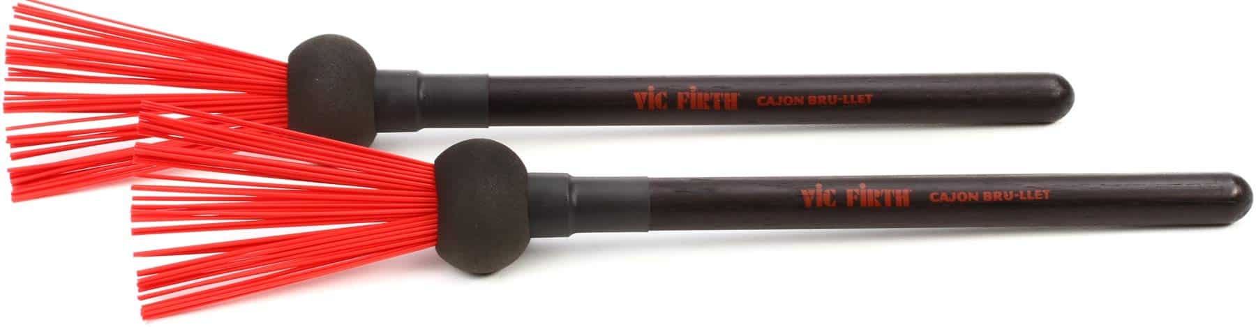 El Cajon bru-llet combina elementos de un cepillo y un mazo para traducir brillantemente tanto los tonos de palmada como los tonos de bajo al Cajon. Mango de nogal con cerdas de plástico de rigidez media y una cabeza de mazo de 1 1 2 hecha de espuma de XL PE. Se vende en pares.