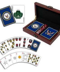 Presentamos nuestro juego de cartas y dados Premium de la Armada de los EE. UU. – un combinación de tradición, orgullo y calidad. Diseñado con atención al detalle, este set no es solo para noches de juego, sino que sirve como un tributo al valor de nuestro personal de la Armada.